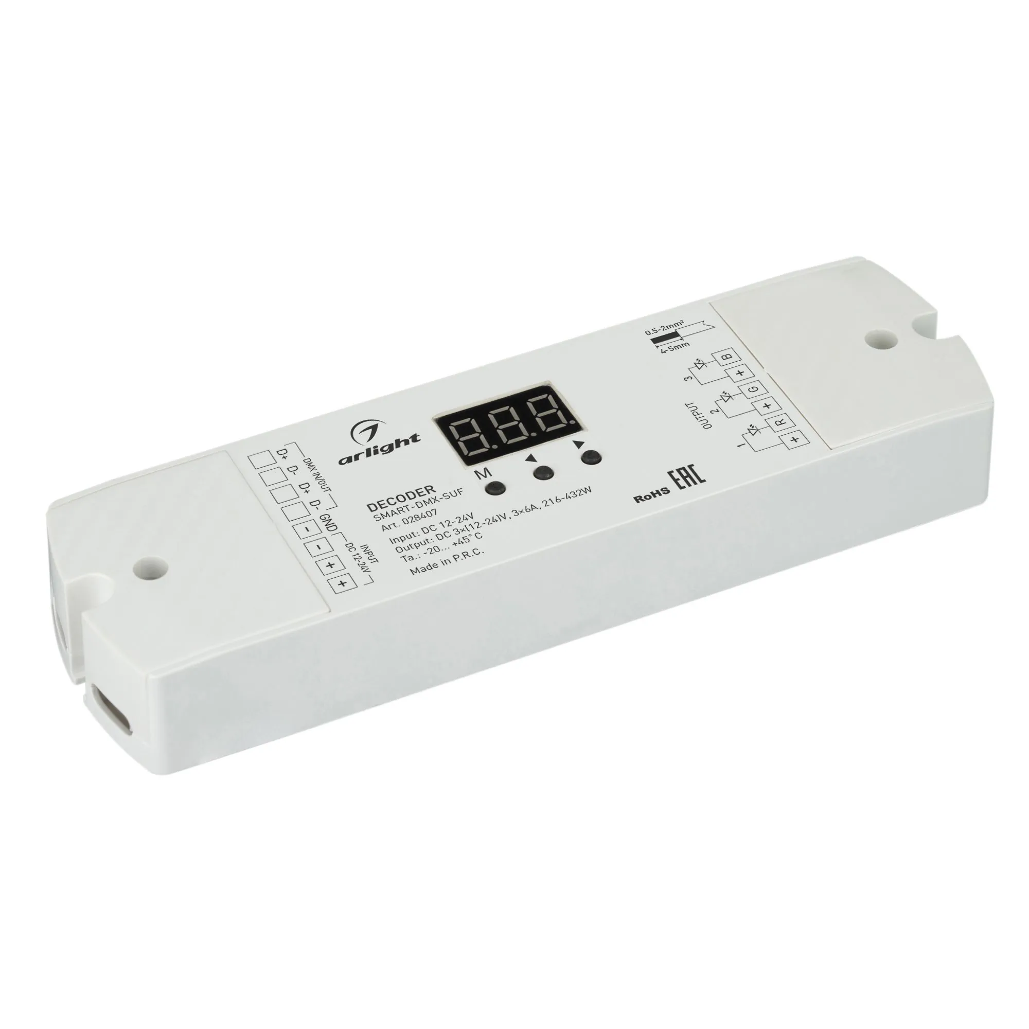 Артикул: 028407; Бренд: Arlight; товарная группа: Декодер; Назначение: Для систем DMX; Тип крепления: накладной; Степень защиты: IP20; Цвет: белый; Наличие пульта: DMX; Длина, мм: 170; Ширина, мм: 50; высота: 23