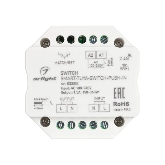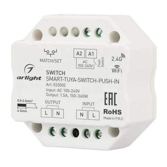 Arlight 033002 Контроллер-выключатель SMART-TUYA-SWITCH-PUSH-IN (230V, 1,5A, WiFi, 2,4G) (Arlight, IP20 Пластик, 5 лет) 033002