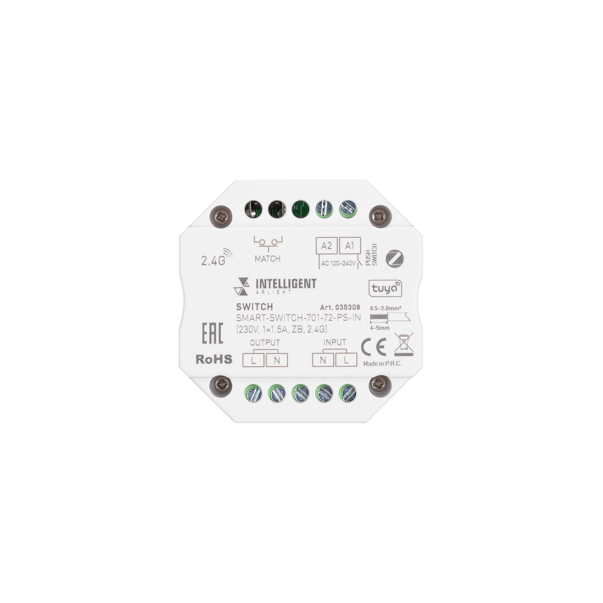 Артикул: 035308; Бренд: Arlight; товарная группа: Релейный модуль; Назначение: Для систем Tuya; Тип крепления: встраиваемый; Степень защиты: IP20; Напряжение питания, V: 230; Цвет: белый; Наличие пульта: TUYA; Длина, мм: 52; Ширина, мм: 52; высота: 26