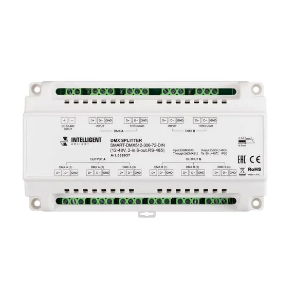 Arlight 038937 INTELLIGENT ARLIGHT Сплиттер SMART-DMX512-306-72-DIN (12-48V, 2-in, 6-out, RS-485) (IARL, IP20 Металл, 5 лет) 038937