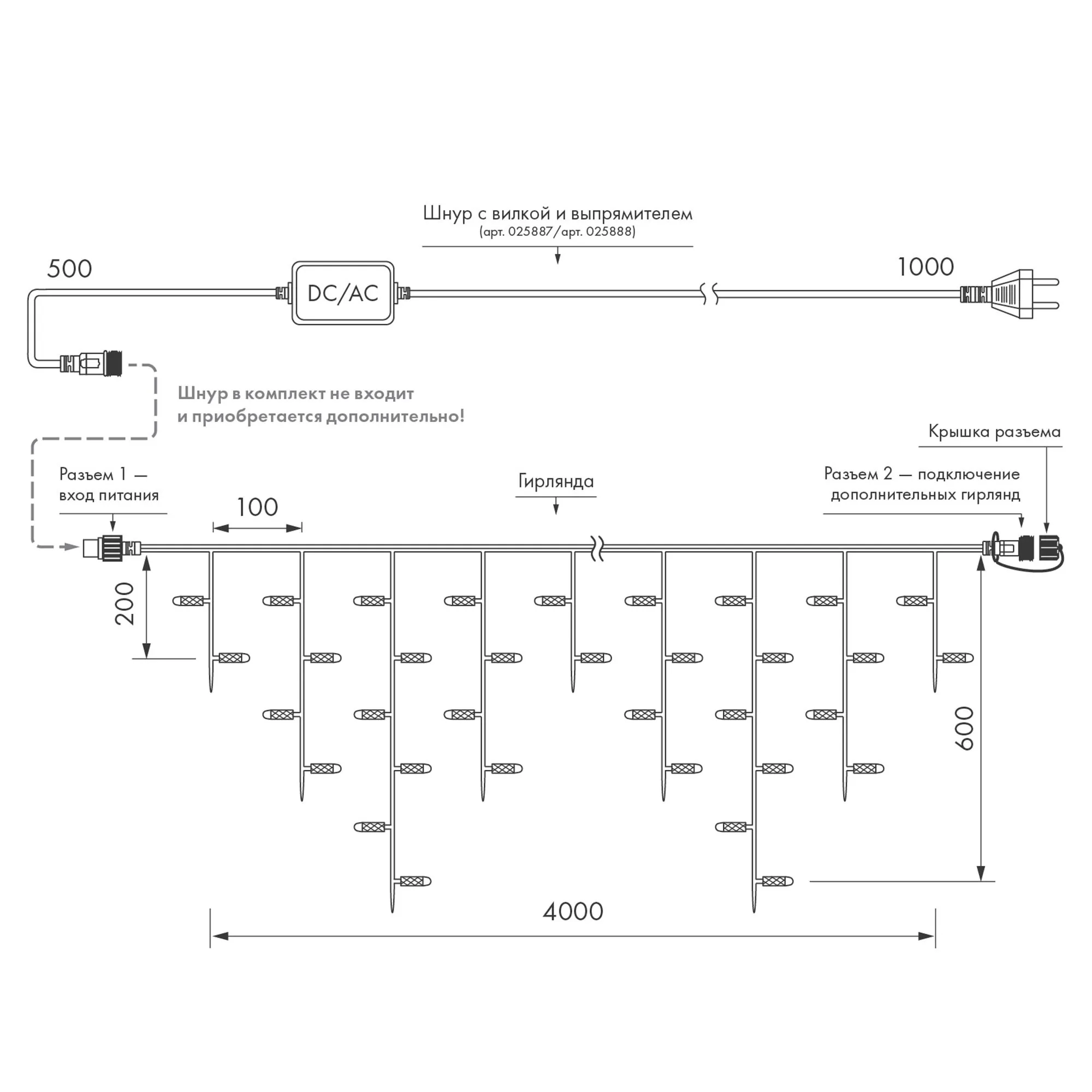 Артикул: 034110; Бренд: Arlight; товарная группа: гирлянда; Степень защиты: IP65; Напряжение питания, V: 230; Температурный режим: -40 °C - 40 °C; Общая мощность, W: 8; Цветовая температура, K: 2700, 3000; Длина, мм: 4000; Ширина, мм: 10; высота: 600; Диаметр, мм: 3.3