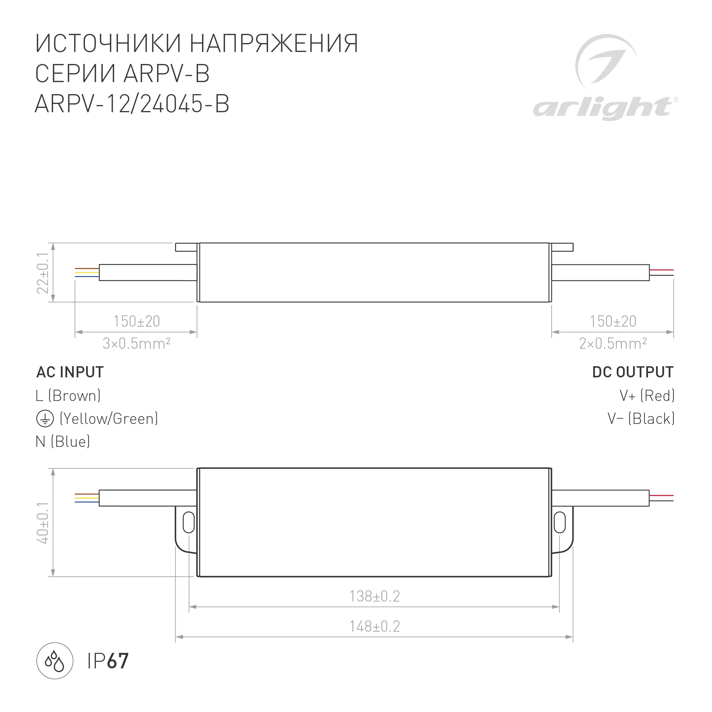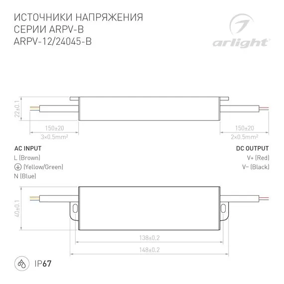 Артикул: 021965; Бренд: Arlight; товарная группа: Источник напряжения; Степень защиты: IP67; Класс электро-безопасности: I; Температурный режим: -25 °C - 50 °C; Гарантия, мес: 36; Длина, мм: 148; Ширина, мм: 40; высота: 22