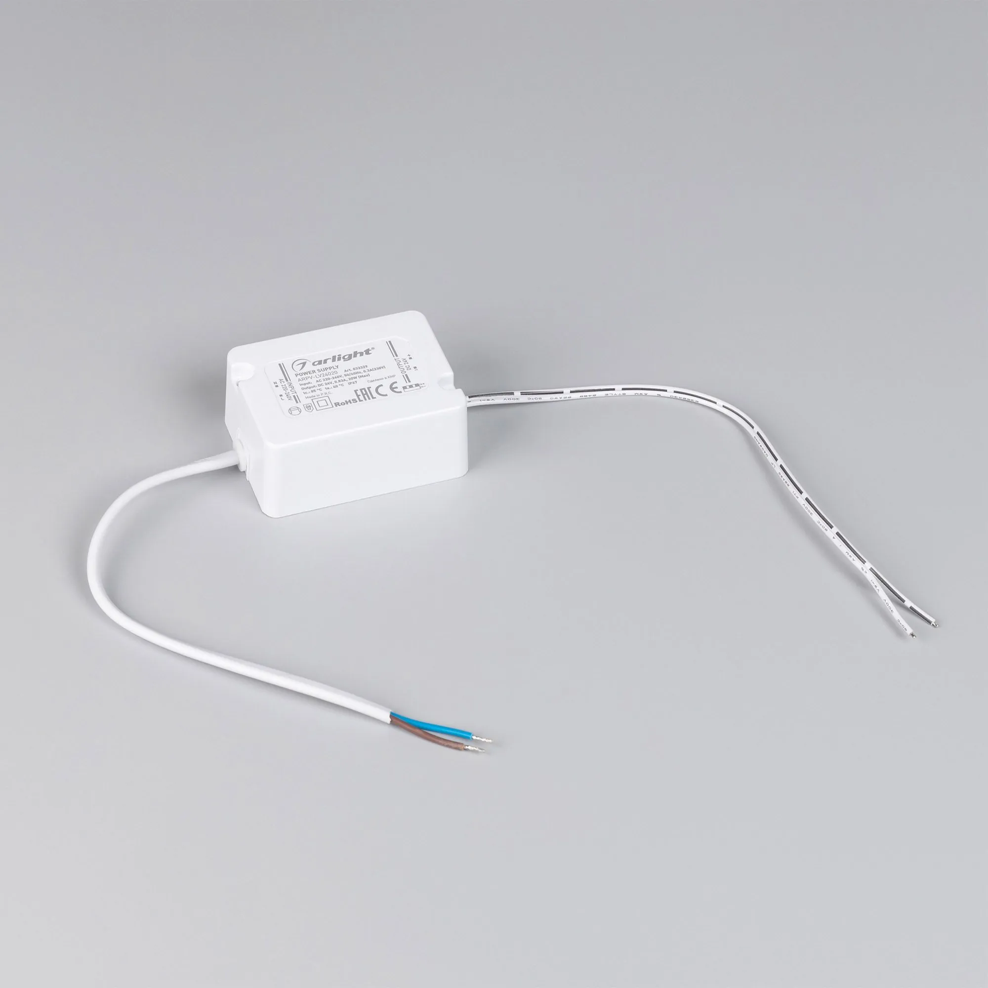 Артикул: 033329; Бренд: Arlight; товарная группа: Источник напряжения; Степень защиты: IP67; Класс электро-безопасности: II; Температурный режим: -10 °C - 40 °C; Гарантия, мес: 36; Длина, мм: 64; Ширина, мм: 47.5; высота: 28