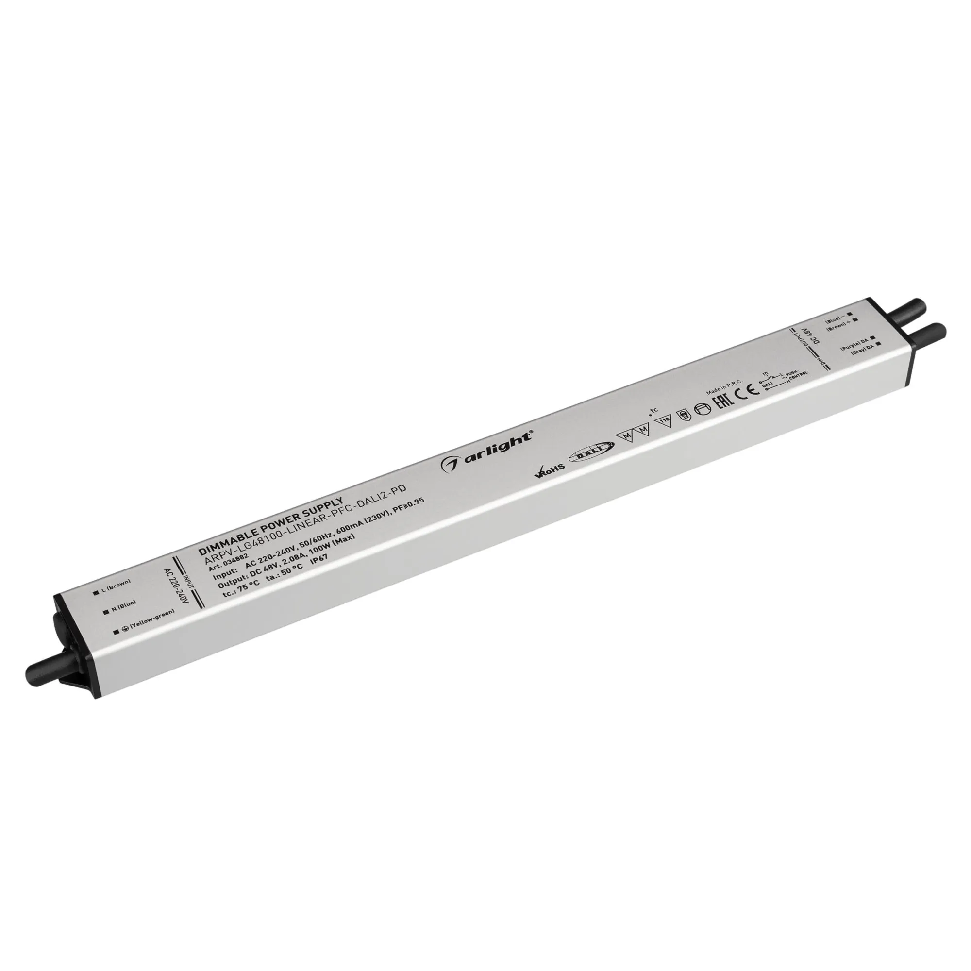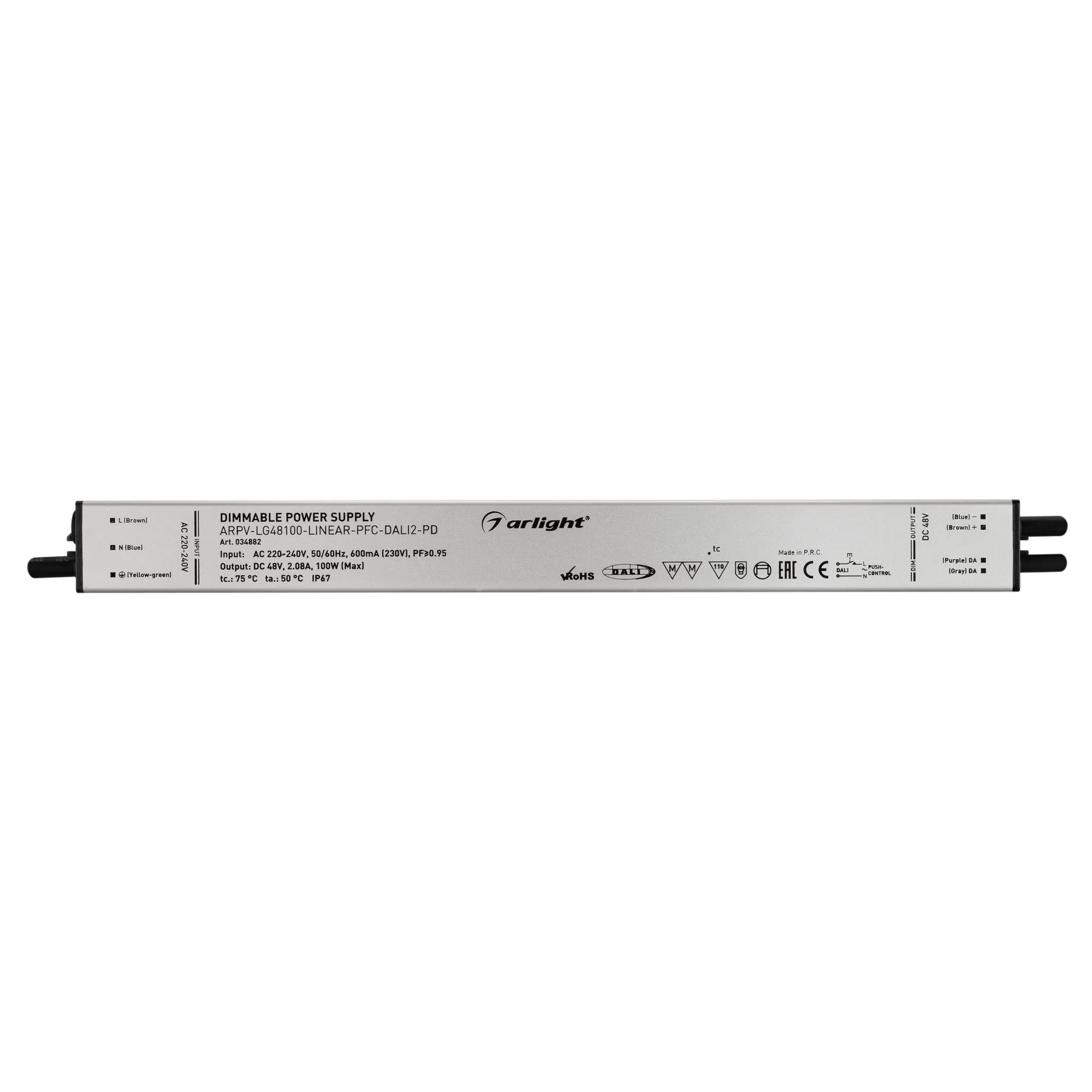 Артикул: 034882; Бренд: Arlight; товарная группа: Диммируемый источник напряжения; Степень защиты: IP67; Класс электро-безопасности: I; Температурный режим: -20 °C - 50 °C; Диммирование: да; Наличие пульта: DALI2; Гарантия, мес: 60; Длина, мм: 320; Ширина, мм: 30; высота: 21