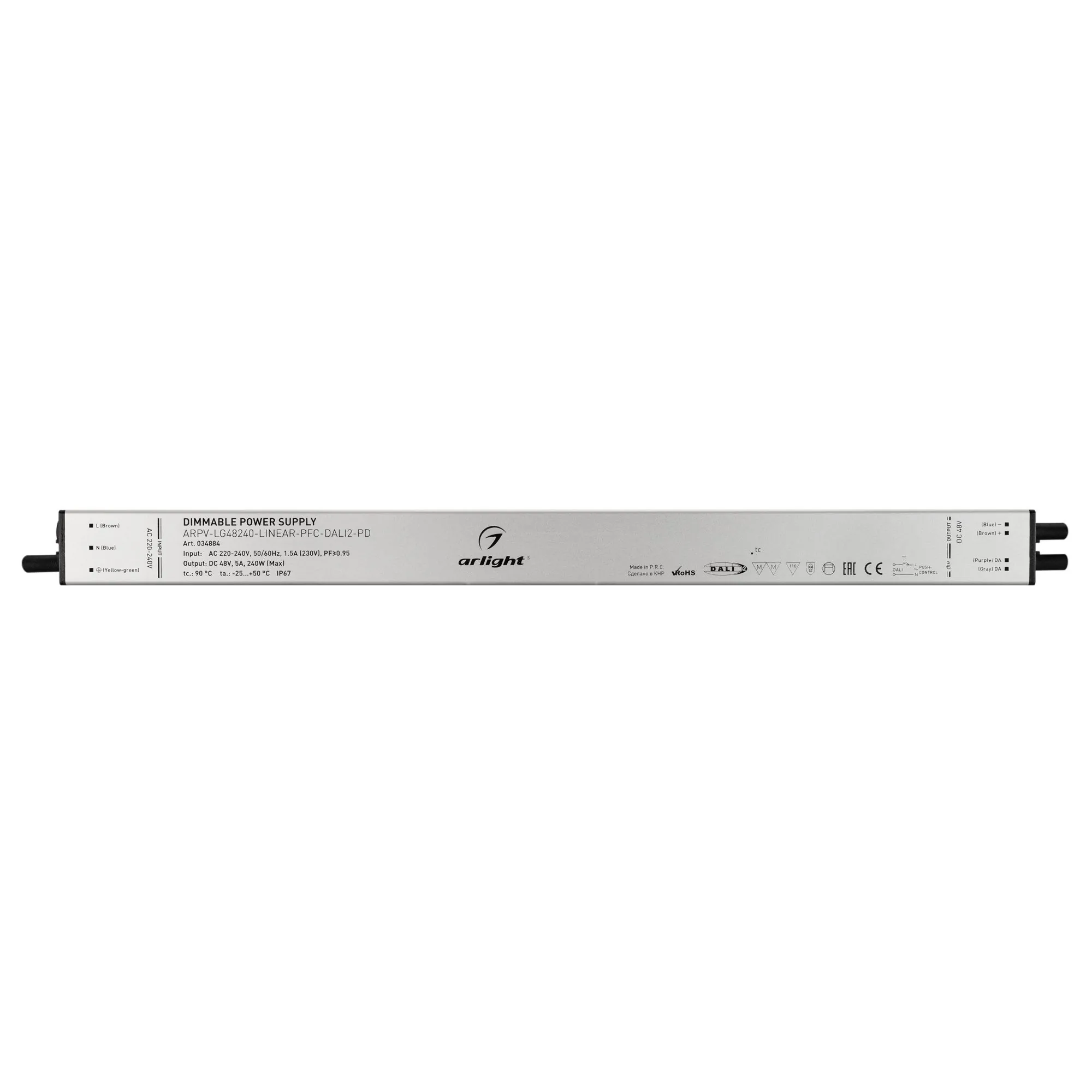 Артикул: 034884; Бренд: Arlight; товарная группа: Диммируемый источник напряжения; Степень защиты: IP67; Класс электро-безопасности: I; Температурный режим: -25 °C - 50 °C; Диммирование: да; Наличие пульта: DALI2; Гарантия, мес: 60; Длина, мм: 400; Ширина, мм: 30; высота: 21
