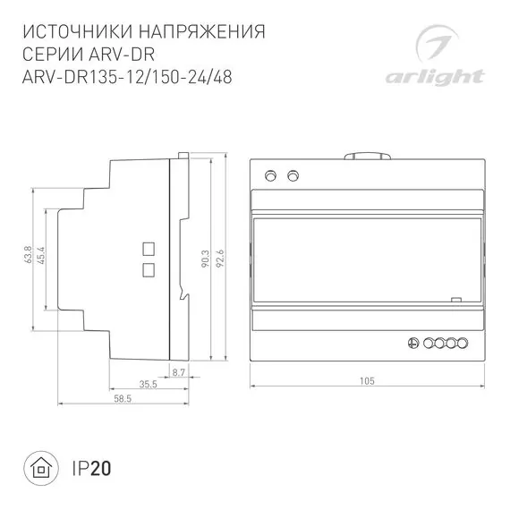 Артикул: 035699; Бренд: Arlight; товарная группа: Источник напряжения; Степень защиты: IP20; Температурный режим: -20 °C - 50 °C; Гарантия, мес: 36; Длина, мм: 58; Ширина, мм: 105; высота: 90
