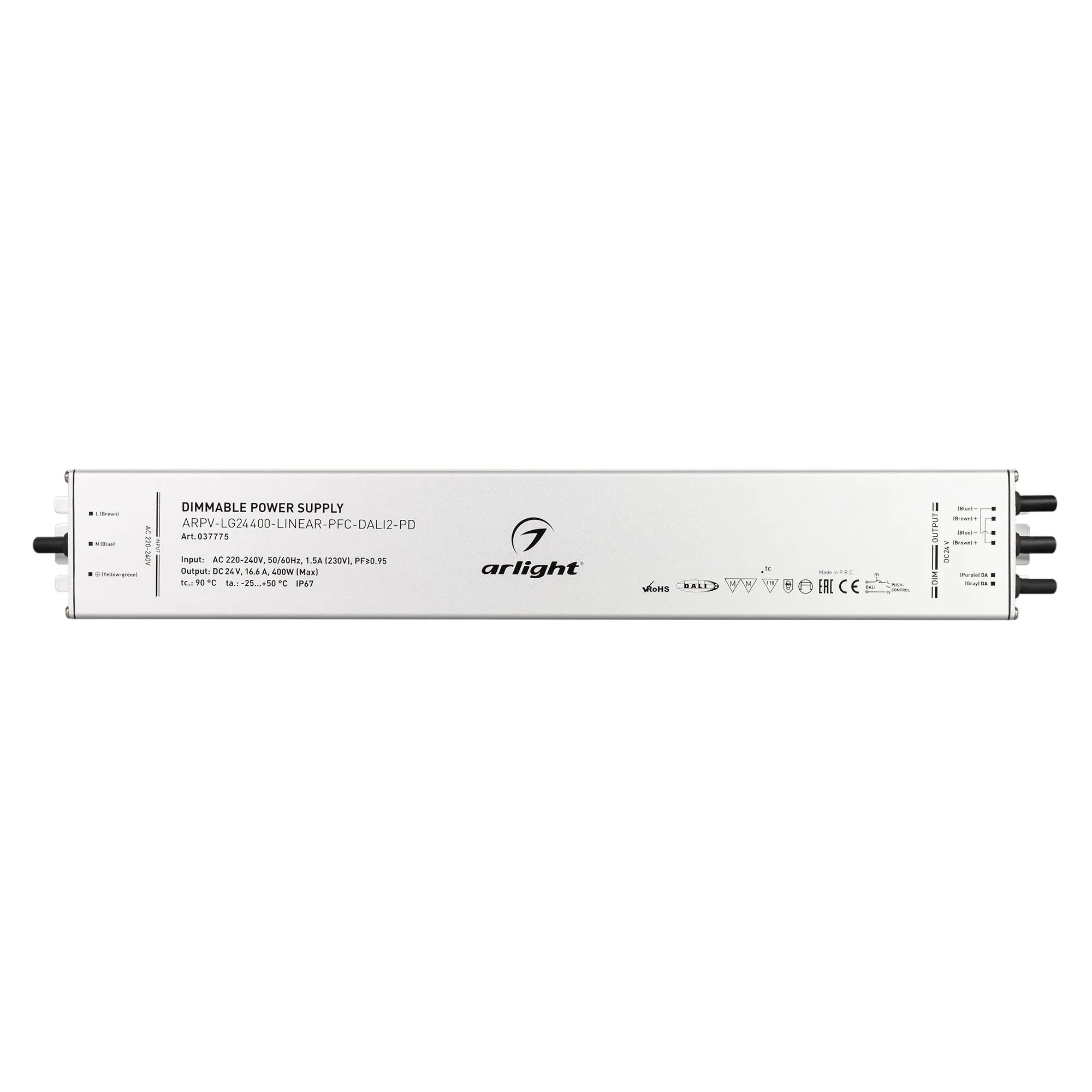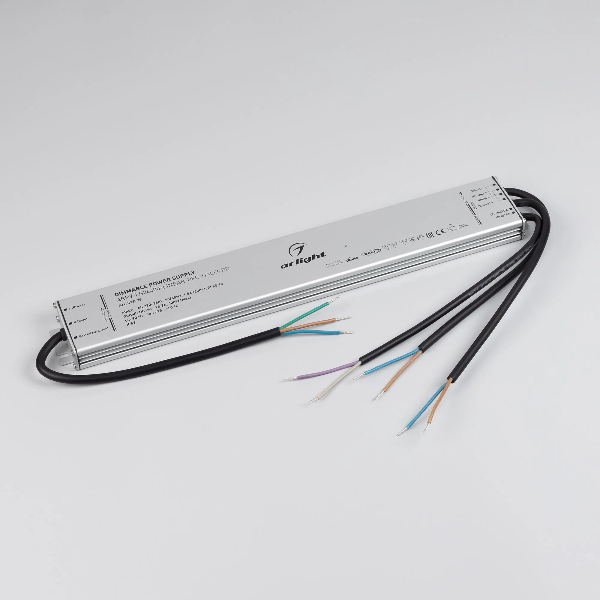 Артикул: 037775; Бренд: Arlight; товарная группа: Диммируемый источник напряжения; Степень защиты: IP67; Класс электро-безопасности: I; Температурный режим: -25 °C - 50 °C; Диммирование: да; Наличие пульта: DALI2; Гарантия, мес: 60; Длина, мм: 400; Ширина, мм: 60; высота: 22
