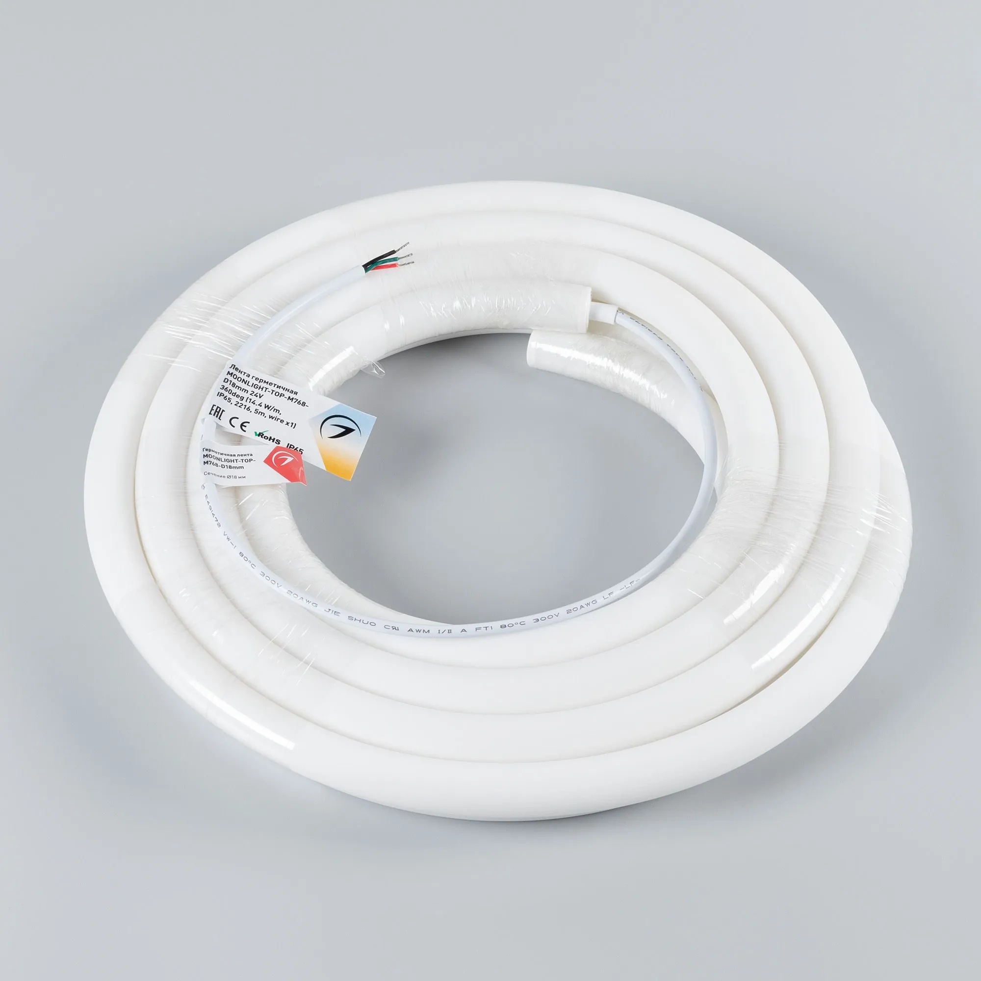 Arlight 037566 Лента герметичная MOONLIGHT-TOP-M768-D18mm 24V White-MIX 360deg (14.4 W/m, IP65, 2216, 5m, wire x1) (Arlight, Вывод прямой, 3 года) - ! УПАКОВКА СОСТОИТ ИЗ - 5 м/п