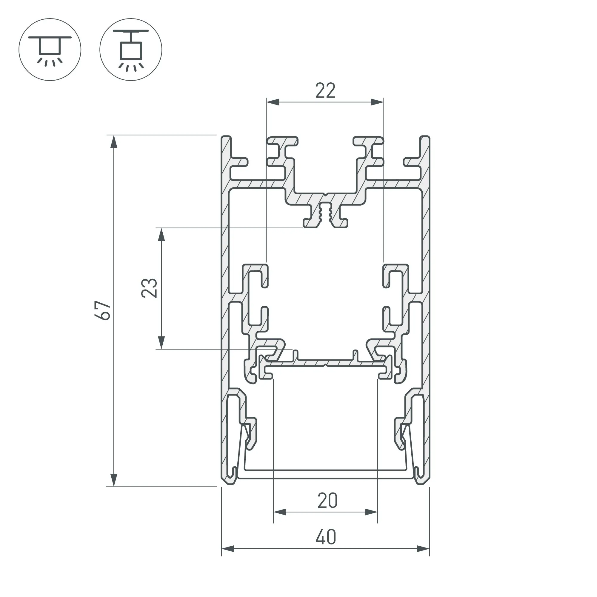 Артикул: 021172; Бренд: Arlight; товарная группа: профиль; Назначение: Для прямоугольных светильников; Тип крепления: Накладной / Подвесной / Встраиваемый; Цвет: Серебристый; Гарантия, мес: 24; Длина, мм: 2500; Ширина, мм: 40; высота: 67