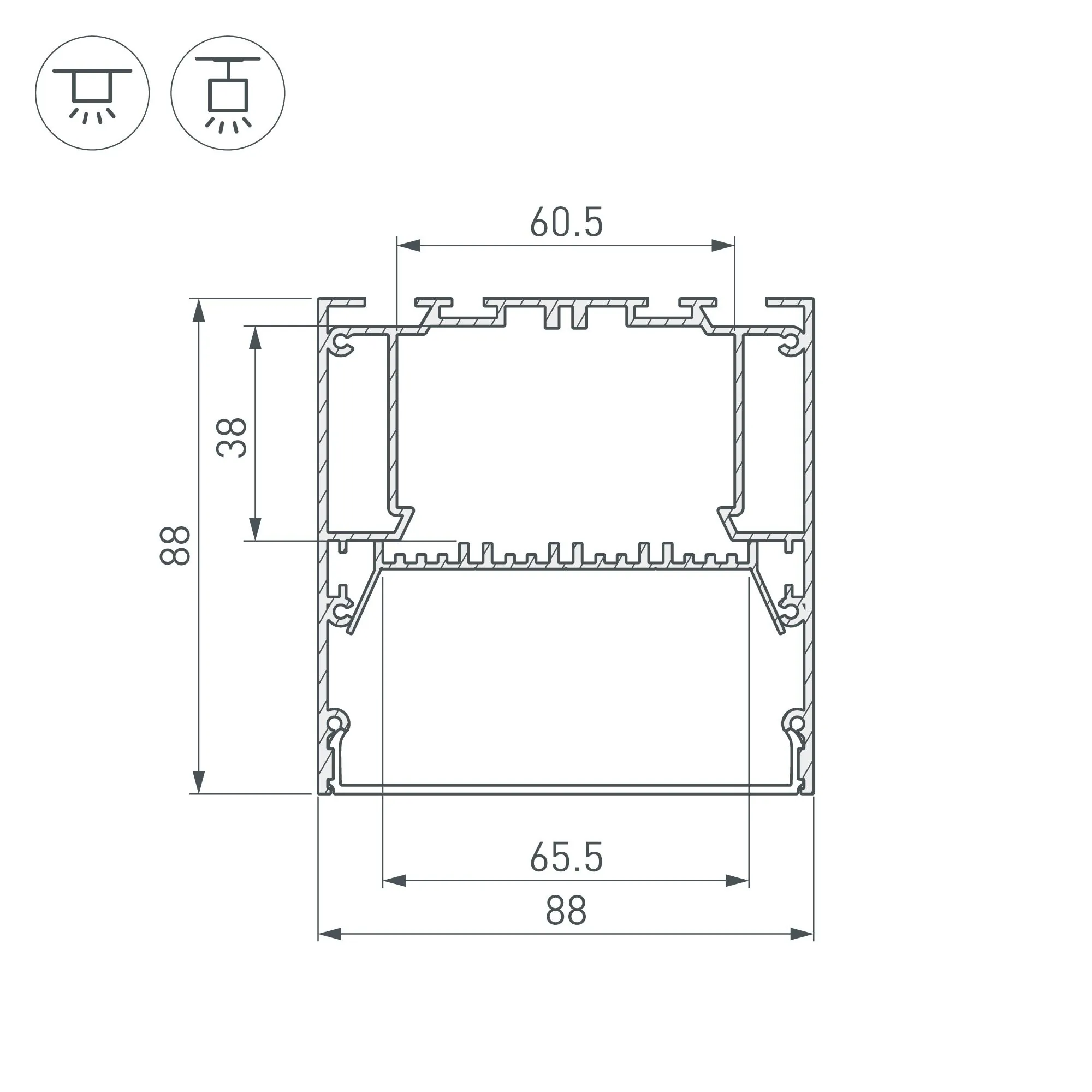 Артикул: 036362; Бренд: Arlight; товарная группа: профиль; Назначение: Для прямоугольных светильников; Тип крепления: Накладной / Подвесной; Цвет: Серебристый; Гарантия, мес: 24; Длина, мм: 2000; Ширина, мм: 88; высота: 88