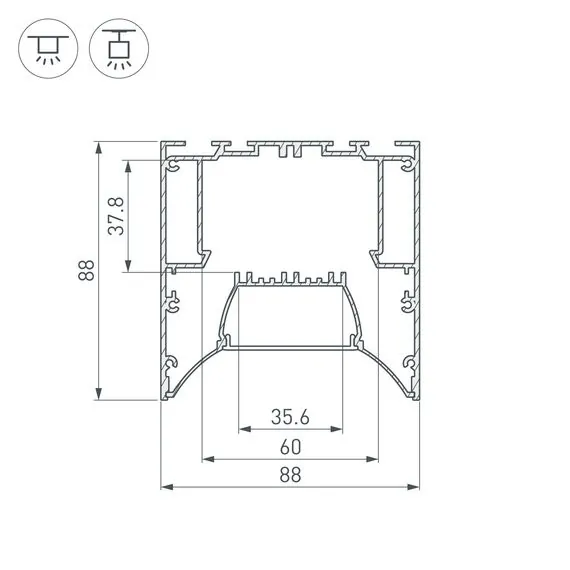 Артикул: 036363; Бренд: Arlight; товарная группа: профиль; Назначение: Для прямоугольных светильников; Тип крепления: Накладной / Подвесной; Цвет: Серебристый; Гарантия, мес: 24; Длина, мм: 2000; Ширина, мм: 88; высота: 88