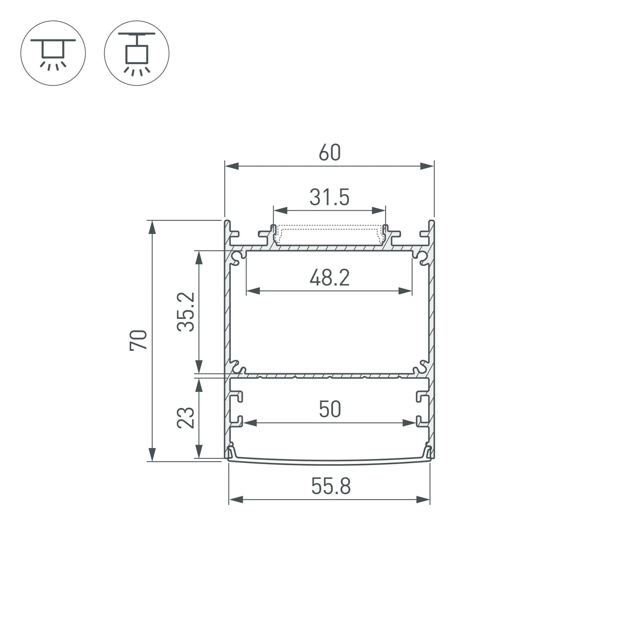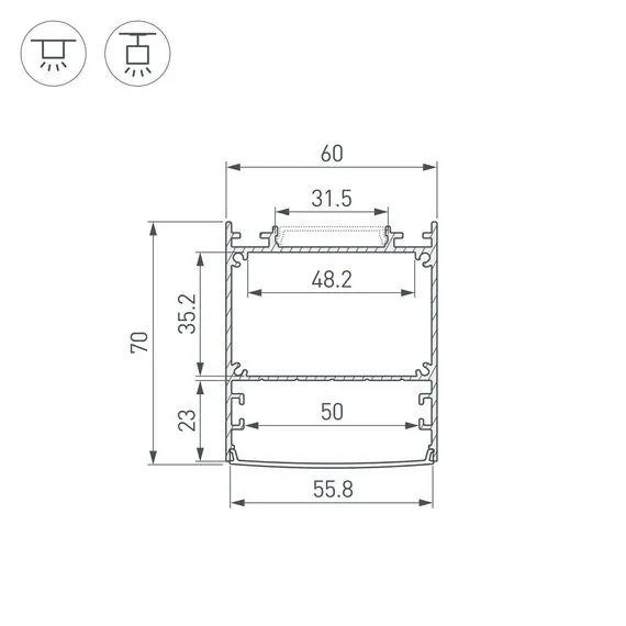 Артикул: 047502; Бренд: Arlight; товарная группа: профиль; Назначение: Для прямоугольных светильников; Тип крепления: Накладной / Подвесной; Цвет: Серебристый; Гарантия, мес: 36; Длина, мм: 3000; Ширина, мм: 60; высота: 70