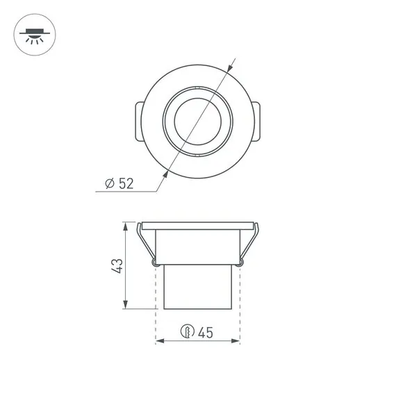 Артикул: 014914; Бренд: Arlight; товарная группа: Светильник; Тип крепления: встраиваемый; Степень защиты: IP40; Напряжение питания, V: 230; Угол рассеивания, град: 30; Класс электро-безопасности: II; Общая мощность, W: 3; Световой поток, Lm: 140, 160; Цветовая температура, K: 4000, 4000 - 4500; Индекс цветопередачи: >80; Цвет: белый; Диммирование: При замене драйвера; Гарантия, мес: 36; Длина, мм: 52; Ширина, мм: 52; высота: 43; Диаметр, мм: 52; Диаметр монтажного отверстия, мм: 45; Глубина монтажного отверстия, мм: 40
