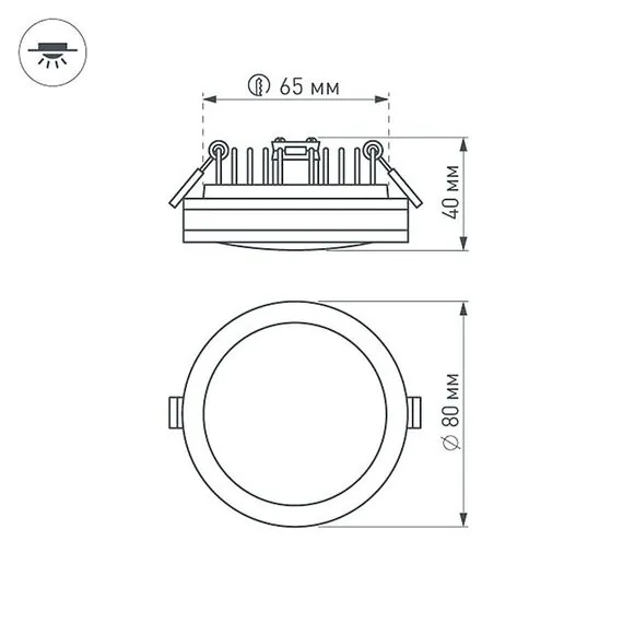 Артикул: 017988; Бренд: Arlight; товарная группа: Светильник; Тип крепления: встраиваемый; Степень защиты: IP44; Напряжение питания, V: 230; Угол рассеивания, град: 120; Класс электро-безопасности: II; Общая мощность, W: 5; Световой поток, Lm: 400; Цветовая температура, K: 3000; Индекс цветопередачи: >80; Цвет: белый; Диммирование: При замене драйвера; Гарантия, мес: 36; Длина, мм: 80; Ширина, мм: 80; высота: 40; Диаметр, мм: 80; Диаметр монтажного отверстия, мм: 65; Глубина монтажного отверстия, мм: 30