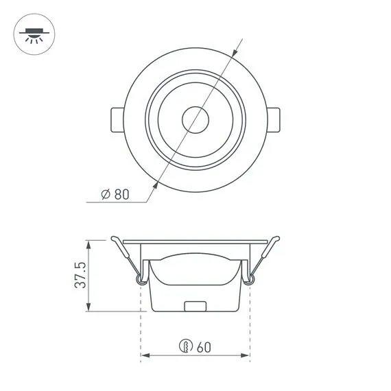 Артикул: 032857; Бренд: Arlight; товарная группа: Светильник; Тип крепления: встраиваемый; Степень защиты: IP20; Напряжение питания, V: 230; Угол рассеивания, град: 36; Класс электро-безопасности: II; Общая мощность, W: 4.5; Световой поток, Lm: 400; Цветовая температура, K: 3000; Индекс цветопередачи: >80; Цвет: белый; Диммирование: нет; Гарантия, мес: 36; Длина, мм: 80; Ширина, мм: 80; высота: 37.5; Диаметр, мм: 80; Диаметр монтажного отверстия, мм: 60