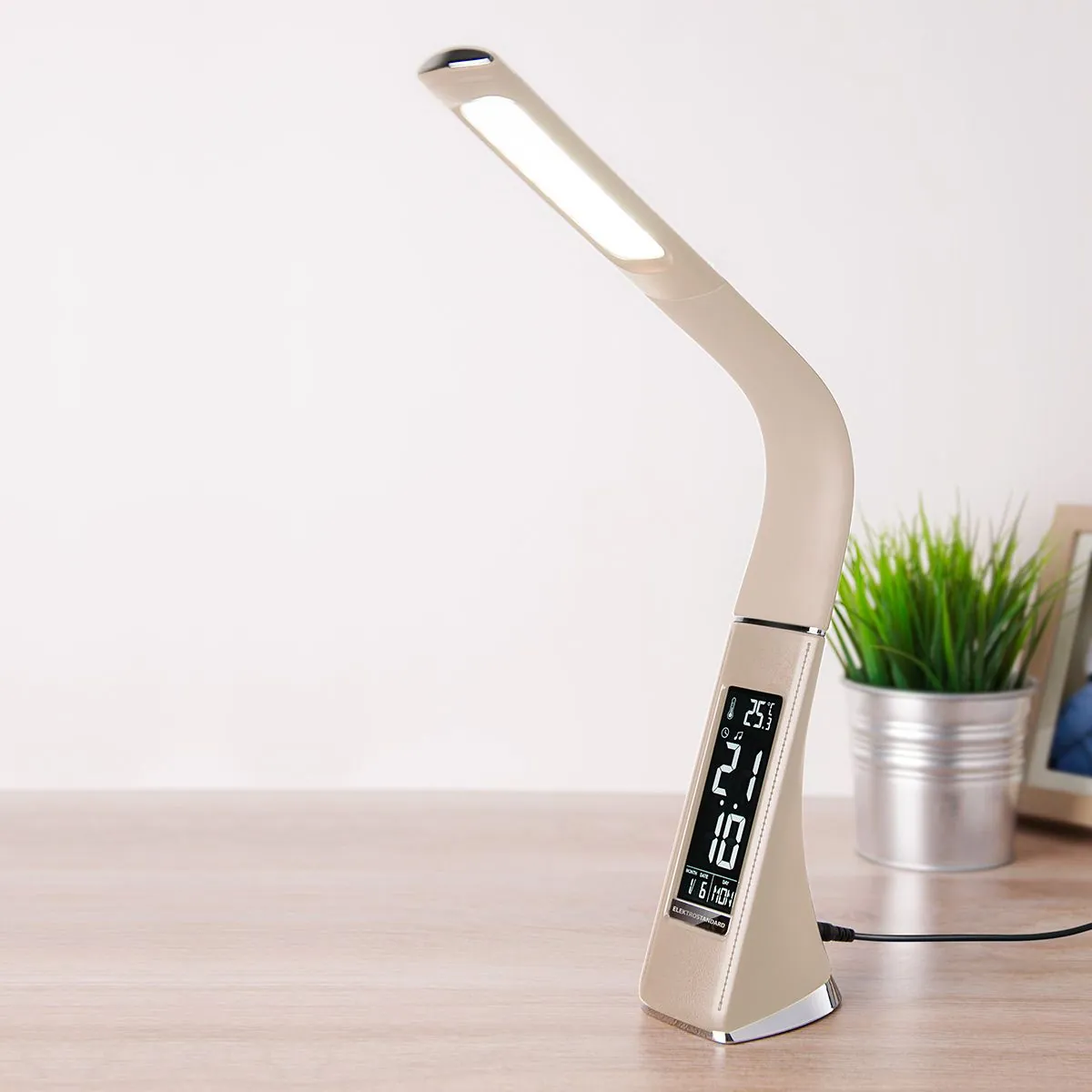 Артикул: TL90220; Бренд: Elektrostandard; Серия: ELARA; Стиль: Авангард; High-tech; Minimalism; Modern; Техно; товарная группа: Настольные лампы; Тип светильника: встроенные LED; место размещения: детская;кабинет;офис;гостиная;спальня;гостиница;кафе; Степень защиты: IP20; Питание: 230 В, 50 Гц; Класс электро-безопасности: II; Электромагнитная совместимость: Да; Температурный режим: -20 ... +40; Разъем кабеля: Jack 3.4; Коэффициент пульсации, %: < 5; Кол-во светодиодов: 25; Тип светодиодов: SMD; Max мощность лампы, W: антискользящая подставка;будильник;сенсорное управление;термометр;часы;календарь;диммер;поворотный плафон; Общая мощность, W: 6; Световой поток, Lm: 280; Цветовая температура, K: 4200; Индекс цветопередачи: >80; Срок службы светодиодов, ч: 50000; Материал: Пластик; Цвет: бежевый; Цвет каркаса: бежевый, Бежевый; Умный дом: совместим с умной розеткой; Гарантия, мес: 60; Длина, мм: 90; Ширина, мм: 65; высота: 510; Длина кабеля, м: 1