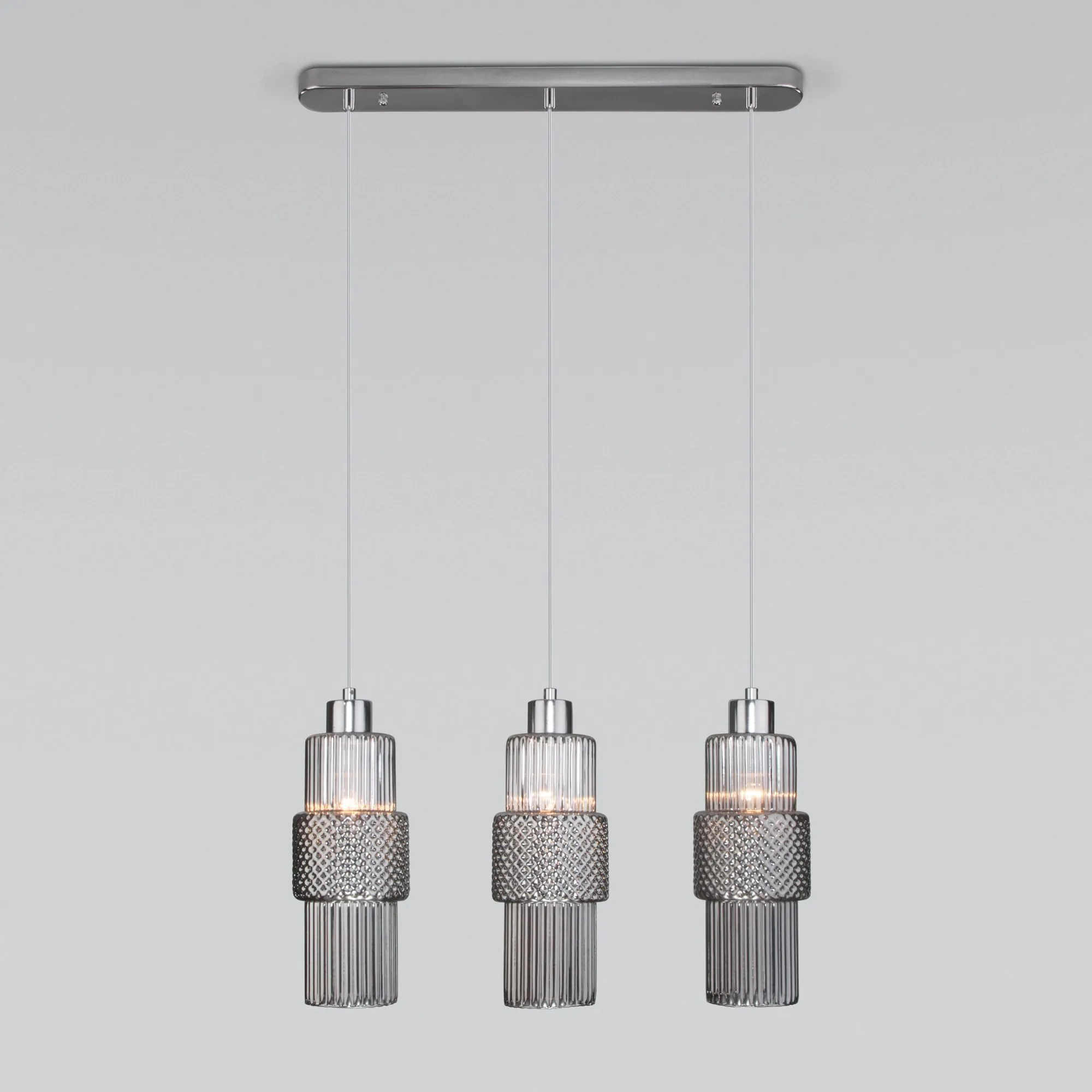 Артикул: 50209/3; Бренд: Eurosvet; Серия: Soho; Стиль: Art Deco; товарная группа: подвесной акцентный светильник; Тип светильника: сменная лампа; место размещения: гостиница;гостиная;загородный дом;офис;кабинет;кафе;кухня;спальня; Срок службы, г: 8; Тип крепления: планка; Степень защиты: IP20; Питание: 230 В, 50 Гц; Площадь освещения, м2: 6; Класс электро-безопасности: I; Температурный режим: -10 ... +40; Тип ламп: металл; Тип цоколя: E27; Материал: металл;стекло; Материал плафона: стекло, Стекло; Цвет: хром;дымчатый; Цвет каркаса: хром, Хром; Цвет плафона: дымчатый, Дымчатый; Умный дом: совместим с умным реле;совместим с умным выключателем; Гарантия, мес: 12; Длина, мм: 580; Ширина, мм: 110; min высота: 400; max высота: 1200; Высота встраиваемой части, мм: 40; Вес упаковки, кг: 1.958; Длина упаковки, см: 59.9; Ширина упаковки, см: 16.3; Высота упаковки, см: 34.2; Объем упаковки, м3: 0.03339185; Штрихкод: 4690389174865
