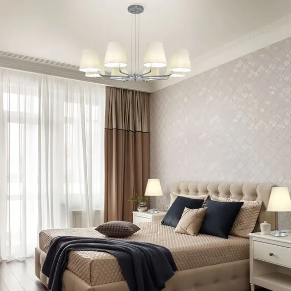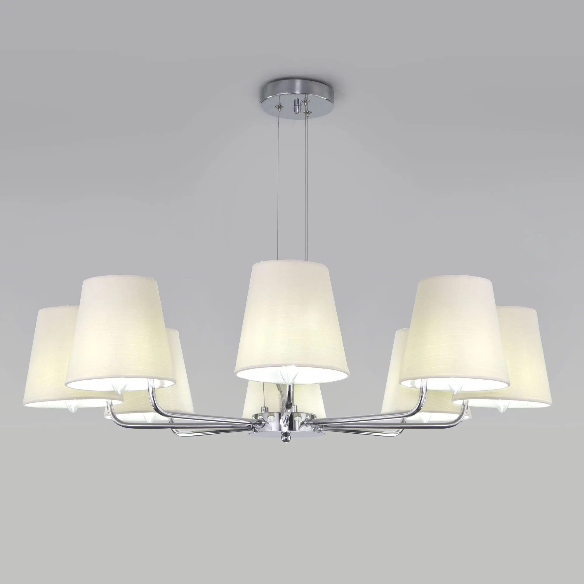Артикул: 60155/8; Бренд: Eurosvet; Серия: Amaretto; Стиль: Classic; товарная группа: Подвесной светильник; Тип светильника: сменная лампа; место размещения: спальня;гостиная; Срок службы, г: 6; Тип крепления: планка; Степень защиты: IP20; Питание: 230 В, 50 Гц; Площадь освещения, м2: 14; Класс электро-безопасности: I; Температурный режим: -10 ... +40; Тип ламп: металл; Тип цоколя: E14; Материал: металл;ткань; Материал плафона: ткань; Цвет: хром; Цвет каркаса: хром, Хром; Цвет плафона: бежевый, Бежевый; Умный дом: совместим с умным выключателем;совместим с умным реле; Гарантия, мес: 12; Длина, мм: 800; Ширина, мм: 800; min высота: 250; max высота: 570; Диаметр потолочной чаши, мм: 120; Высота встраиваемой части, мм: 40; Вес упаковки, кг: 3.033; Длина упаковки, см: 45.3; Ширина упаковки, см: 27.2; Высота упаковки, см: 19.9; Объем упаковки, м3: 0.02451998; Штрихкод: 4690389201042