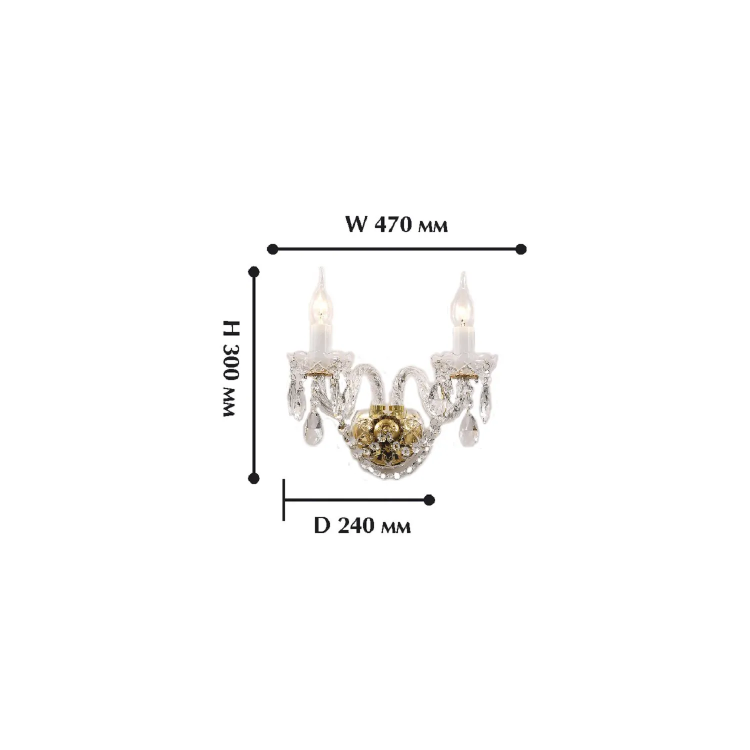 Артикул: 1735-2W; Бренд: Favourite; Коллекция: Monreal; Стиль: Crystal; Назначение: гостиная; спальня; кухня; детская; холл; кафе; ресторан; кабинет; столовая; студия; Тип светильника: Бра; Тип крепления: планка; Степень защиты: IP20; Площадь освещения, м2: 4; Напряжение питания, V: 220; Натяжные потолки: Нет; Тип ламп: 2*E14*40W, excluded; Общая мощность, W: 80; Материал: металл, стекло, хрусталь; Материал каркаса: металл, Металл; Цвет каркаса: золотой, Золотой; Диммирование: нет; Наличие пульта: Нет; Гарантия, мес: 36; Ширина, мм: 470; min высота: 300; max высота: 300; Глубина, мм: 210; Вес, кг: 1.2; Вес упаковки, кг: 1.8; Длина упаковки, см: 34; Ширина упаковки, см: 29; Высота упаковки, см: 26; Штрихкод: 4035726120097
