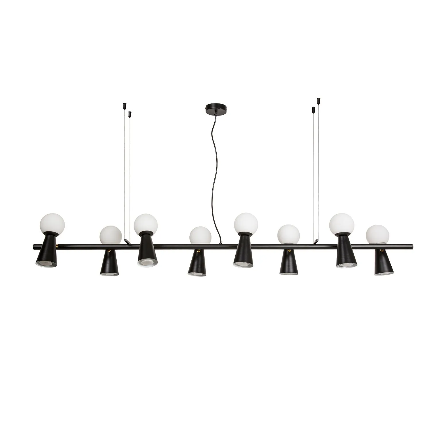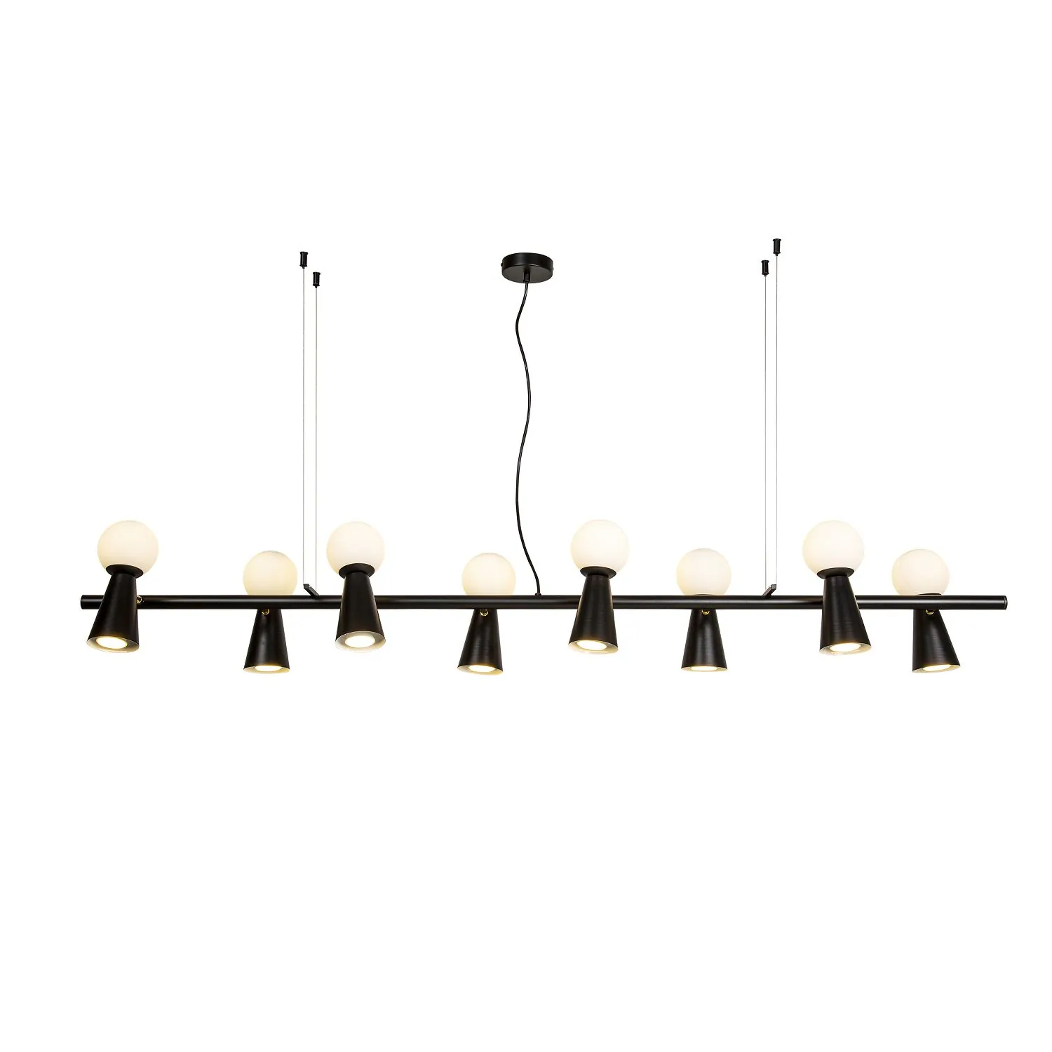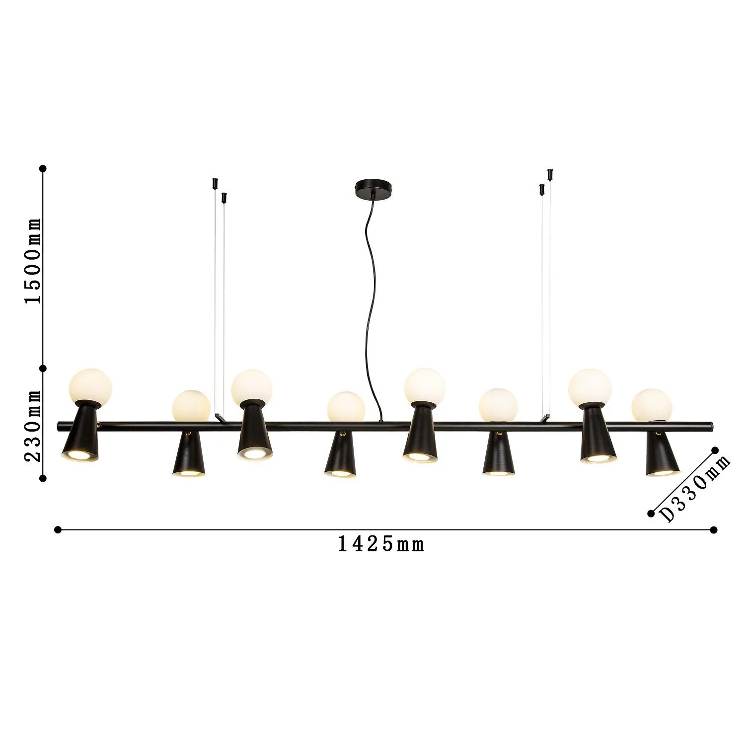 Артикул: 4095-8P; Бренд: Favourite; Коллекция: Gnomes; Стиль: Modern; Назначение: гостиная; спальня; кухня; детская; холл; кафе; ресторан; кабинет; столовая; студия; Тип светильника: подвесная люстра; Тип крепления: планка; Площадь освещения, м2: 23; Тип ламп: 8*G9LED*3W + 8*GU10*35W, excluded; Общая мощность, W: 38; Материал: Металл; Материал плафона: белое стекло; Цвет каркаса: черный, Черный, Чёрный, чёрный; Длина, мм: 1425; Ширина, мм: 330; min высота: 230; max высота: 1730; Диаметр потолочной чаши, мм: D100*H25; Вес, кг: 4.3; Вес упаковки, кг: 5.3; Длина упаковки, см: 144; Ширина упаковки, см: 33; Высота упаковки, см: 12; Штрихкод: 4035726151060