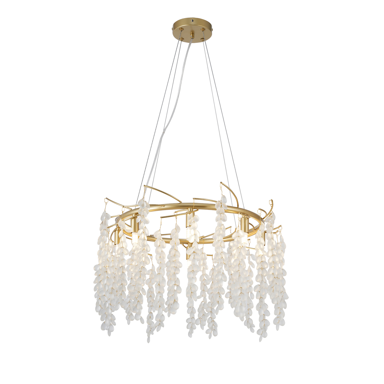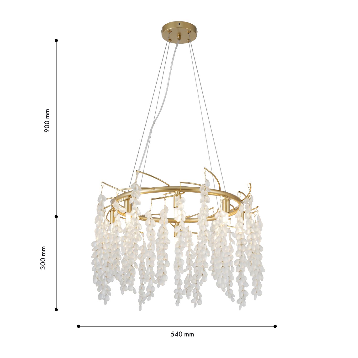 Артикул: 4108-8P; Бренд: Favourite; Коллекция: Desmi; Стиль: Ambient; Назначение: гостиная; спальня; кухня; детская; холл; кафе; ресторан; кабинет; столовая; студия; Тип светильника: подвесная люстра; Тип крепления: планка; Степень защиты: IP20; Площадь освещения, м2: 16; Напряжение питания, V: 220; Натяжные потолки: Да; Тип ламп: 8*G9*40W, excluded; Общая мощность, W: 320; Материал: Металл, Стекло; Материал каркаса: металл, Металл; Материал плафона: стекло, Стекло; Цвет каркаса: золотой, Золотой; Цвет плафона: Матовый Белый, Матовый белый, матовый белый; Диммирование: нет; Наличие пульта: Нет; Гарантия, мес: 36; min высота: 300; max высота: 1200; Диаметр, мм: 540; Высота потолочной чаши, мм: 25; Диаметр потолочной чаши, мм: 120; Высота плафона, мм: 300; Вес, кг: 5.5; Вес упаковки, кг: 6.5; Длина упаковки, см: 55; Ширина упаковки, см: 55; Высота упаковки, см: 31; Штрихкод: 4035726151367