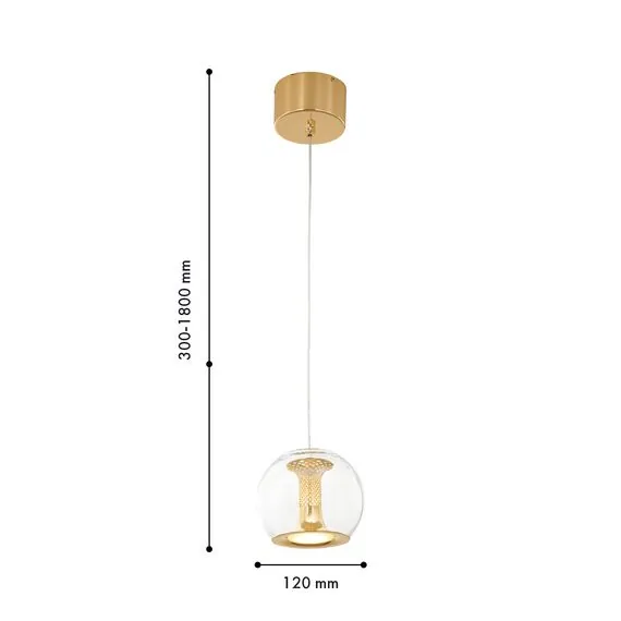 Артикул: 4336-1P; Бренд: Favourite; Коллекция: Sfar; Стиль: Modern; Назначение: гостиная; спальня; кухня; детская; холл; кафе; ресторан; кабинет; столовая; студия; Тип светильника: подвес; Тип крепления: планка; Степень защиты: IP20; Площадь освещения, м2: 2; Напряжение питания, V: 220; Натяжные потолки: Да; Тип ламп: LED*7W, 560LM, 4000K, included; Общая мощность, W: 7; Max цветовая температура, К: 4000; Материал: металл, стекло, акрил; Материал каркаса: металл, Металл; Материал плафона: стекло, Стекло; Цвет каркаса: золотой, Золотой; Цвет плафона: прозрачный, Прозрачный; Диммирование: нет; Наличие пульта: Нет; Гарантия, мес: 36; min высота: 300; max высота: 1800; Диаметр, мм: 120; Высота потолочной чаши, мм: 124.5; Диаметр потолочной чаши, мм: 70; Высота плафона, мм: 100; Вес, кг: 1.5; Вес упаковки, кг: 2.5; Длина упаковки, см: 35; Ширина упаковки, см: 20; Высота упаковки, см: 30.5; Штрихкод: 4035726156034