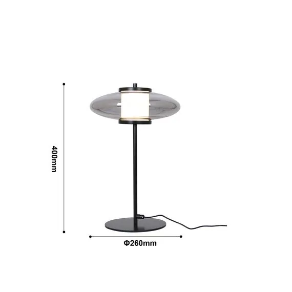 Артикул: 4373-1T; Бренд: Favourite; Коллекция: Rulle; Стиль: Modern; Назначение: гостиная; спальня; кухня; детская; холл; кафе; ресторан; кабинет; столовая; студия; Тип светильника: Настольная лампа; Степень защиты: IP20; Площадь освещения, м2: 2; Напряжение питания, V: 220; Натяжные потолки: Нет; Тип ламп: LED*7W, 490LM, 4000K, CRI>90, included, switch; Общая мощность, W: 7; Max цветовая температура, К: 4000; Индекс цветопередачи: >90; Материал: Металл, Стекло; Материал каркаса: металл, Металл; Материал плафона: стекло, Стекло; Цвет каркаса: черный, Черный, Чёрный, чёрный; Цвет плафона: дымчатосерый; Диммирование: нет; Наличие пульта: Нет; Гарантия, мес: 36; min высота: 400; max высота: 400; Диаметр, мм: 260; Вес, кг: 1.6; Вес упаковки, кг: 1.8; Длина упаковки, см: 46.5; Ширина упаковки, см: 33; Высота упаковки, см: 34; Штрихкод: 4035726156478