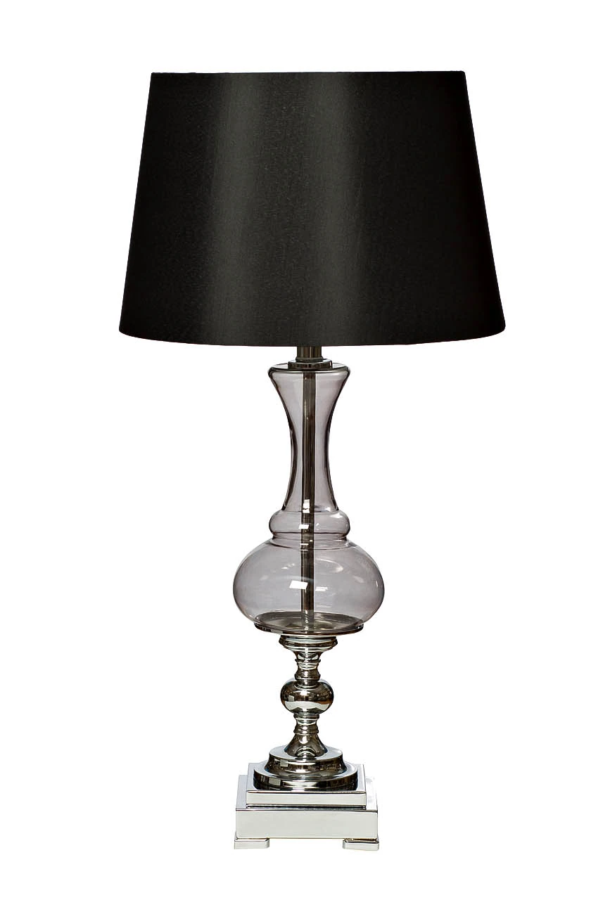 основание из дымчатого стекла и металла цвета хром, плафон - ткань черного цвета