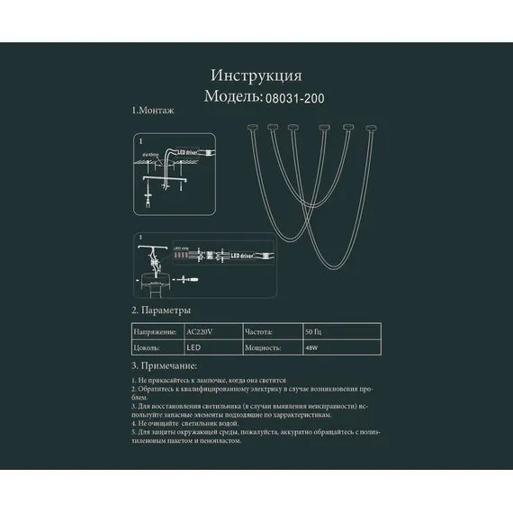 Артикул: 08031-200,19; Бренд: Kink light; Серия: Венди; Стиль: Loft; Тип светильника: Светильники; место размещения: Для гостиной; Степень защиты: IP20; Площадь освещения, м2: 24; Количество ламп: 1; Тип ламп: Led, с led драйвером в комплекте; Тип цоколя: LED; Мощность ламп, W: 48; Общая мощность, W: 48; Световой поток, Lm: 4800; Индекс цветопередачи: Ra > 80; Материал: металл + силикон; Цвет каркаса: черный, Черный; Цвет плафона: белый, Белый; Диммирование: нет; Наличие пульта: Нет; Гарантия, мес: 12; Длина, мм: 2000; Диаметр, мм: 22; Вес упаковки, кг: 1.22; Длина упаковки, см: 56; Ширина упаковки, см: 31.5; Высота упаковки, см: 63.5; Объем упаковки, м3: 0.011; Штрихкод: 6900000800713