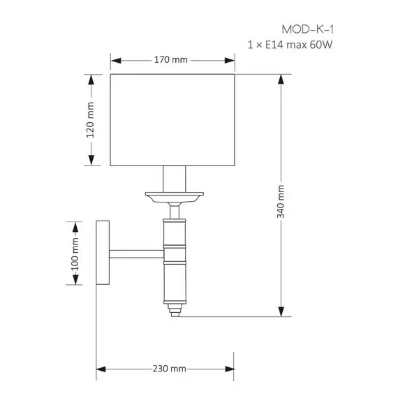 Артикул: MOD-K-1(CZ); Бренд: KUTEK; Серия: Modesto; Стиль: Современная классика; товарная группа: Бра; место размещения: Гостиная, зал, прихожая, коридор, спальня, ванная комната; Форма: Цилиндр; Тип крепления: монтажная пластина; Регулировка по высоте: Нет; Общая мощность, W: 40; Напряжение питания, V: 220; Температурный режим: комнатная температура; Количество ламп: 1; Тип ламп: накаливания, Накаливания; Тип цоколя: 1xE14; Max мощность лампы, W: 40; Материал каркаса: Латунь; Материал плафона: ткань, Ткань; Цвет: черный и золотой; Цвет каркаса: черный и золотой; Цвет плафона: Любой из представленных; Лампы в комплекте: Нет; Диммирование: да; Длина, мм: 170; высота: 340; Глубина, мм: 230