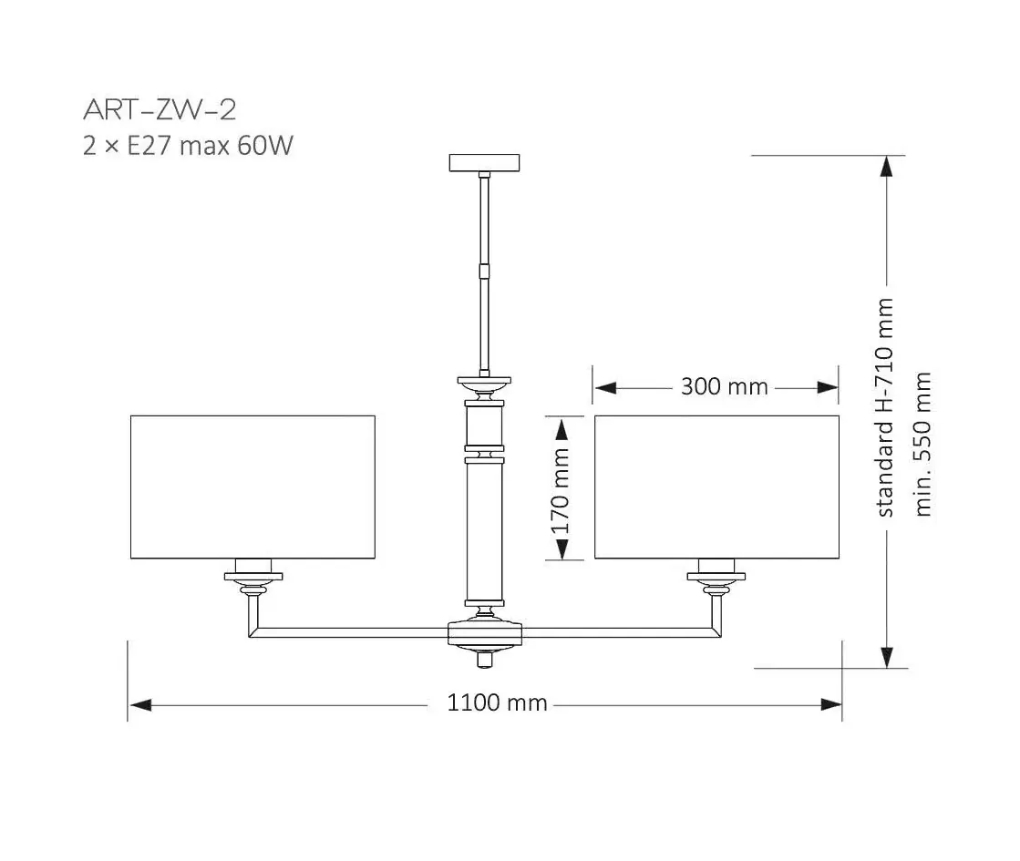 Артикул: ART-ZW-2(N); Бренд: KUTEK; Серия: ARTU; Стиль: Современная классика; товарная группа: Люстра; место размещения: Гостиная, зал, прихожая, коридор, спальня, ванная комната; Форма: Цилиндр; Тип крепления: Крюк; Регулировка по высоте: Да; Напряжение питания, V: 220; Температурный режим: комнатная температура; Количество ламп: 2; Тип ламп: накаливания, Накаливания; Тип цоколя: 2xE27; Max мощность лампы, W: 60; Общая мощность, W: 120; Материал каркаса: Латунь; Материал плафона: ткань, Ткань; Цвет: никель; Цвет каркаса: никель, Никель; Цвет плафона: Любой из представленных; Лампы в комплекте: Нет; Диммирование: да; Длина, мм: 1100; высота: 710; min высота: 550