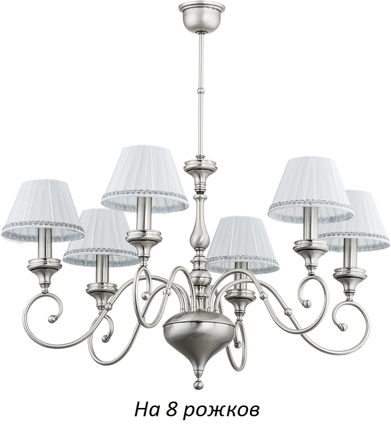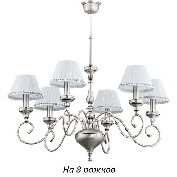 Артикул: TER-ZW-8(N/A); Бренд: KUTEK; Серия: TERAMO; Стиль: Classic; товарная группа: Люстра; место размещения: Гостиная, зал, прихожая, коридор, спальня; Форма: Конус; Тип крепления: монтажная пластина; Регулировка по высоте: Да; Напряжение питания, V: 220; Температурный режим: комнатная температура; Количество ламп: 1; Тип ламп: накаливания, Накаливания; Тип цоколя: 8xE14; Max мощность лампы, W: 40; Общая мощность, W: 40; Материал каркаса: Латунь; Материал плафона: ткань, Ткань; Цвет: никель; Цвет каркаса: никель, Никель; Цвет плафона: Любой из представленных; Лампы в комплекте: Нет; Диммирование: нет; Длина, мм: 800; высота: 700; min высота: 500; Диаметр, мм: 850