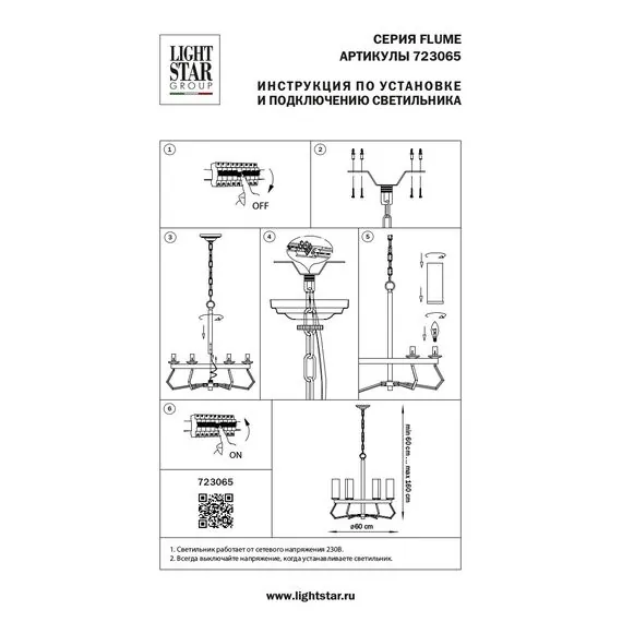 Артикул: 723065; Бренд: Lightstar; Коллекция: Flume; Стиль: Modern; Тип светильника: Подвесная; место размещения: Жилая; Общественная; Тип крепления: Накладной; На планку; Степень защиты: IP20; Напряжение питания, V: 220; Количество ламп: 6; Тип ламп: ГЛН; КЛЛ; LED; Тип цоколя: E14; Мощность ламп, W: 40; Общая мощность LED, W: 36; Общая мощность, W: 240; Материал каркаса: металл, Металл; Материал плафона: стекло, Стекло; Цвет каркаса: никель, Никель; Цвет плафона: белый, Белый; высота: 380; min высота: 650; max высота: 1 650; Диаметр, мм: 570; Высота потолочной чаши, мм: 60; Диаметр потолочной чаши, мм: 135; Вес, кг: 4,35; Штрихкод: 8059018268386