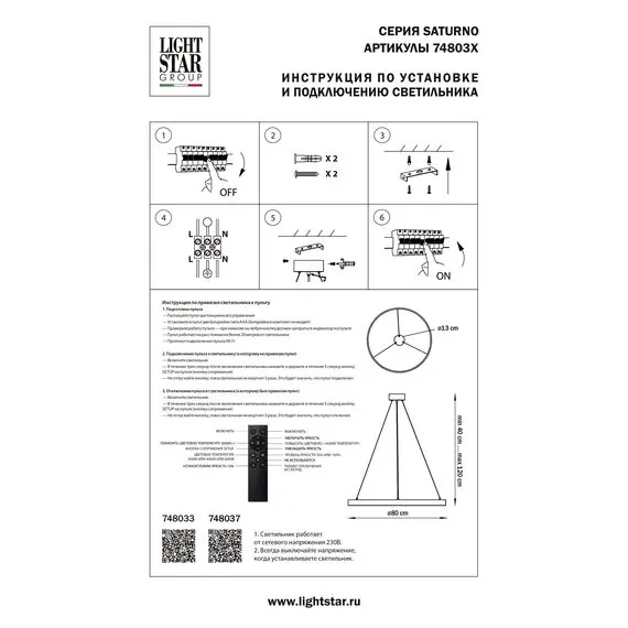 Артикул: 748037; Бренд: Lightstar; Коллекция: Saturno; Стиль: Minimalism; Тип светильника: Подвесная; место размещения: Жилая; Общественная; Срок службы, ч: 20 000; Тип крепления: Накладной; На планку; Степень защиты: IP20; Напряжение питания, V: 220; Угол рассеивания, град: 70; Общая мощность LED, W: 48; Световой поток, Lm: 3 500; Цветовая температура, K: 3000 / 6000; Индекс цветопередачи: 80; Материал каркаса: металл, Металл; Материал плафона: Металл; Акрил; Цвет каркаса: черный, Черный; Цвет плафона: Матовый; Черный; Диммирование: да; Управление светом: Пульт ДУ; Наличие пульта: Радио / Bluetooth; высота: 60; min высота: 450; max высота: 1 400; Диаметр, мм: 800; Высота потолочной чаши, мм: 65; Диаметр потолочной чаши, мм: 130; Вес, кг: 1,95; Штрихкод: 8053176053471