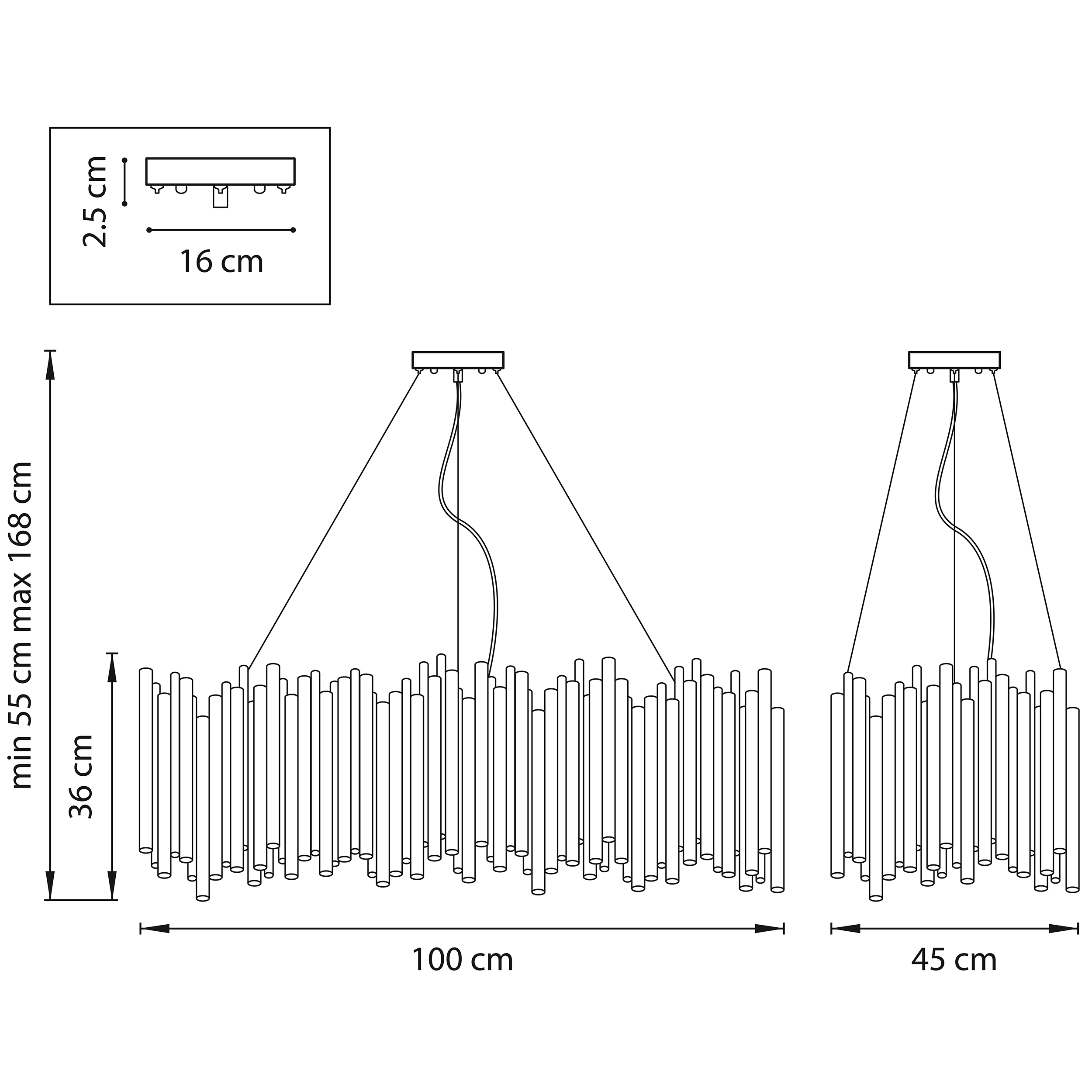 Артикул: 816207; Бренд: Lightstar; Коллекция: Savona; Стиль: Art Deco; Тип светильника: Подвесная; место размещения: Жилая; Общественная; Тип крепления: Накладной; На планку; Степень защиты: IP20; Напряжение питания, V: 220; Количество ламп: 20; Тип ламп: ГЛН; КЛЛ; LED; Тип цоколя: G9; Мощность ламп, W: 40; Общая мощность LED, W: 120; Общая мощность, W: 800; Материал каркаса: металл, Металл; Материал плафона: металл, Металл; Цвет каркаса: черный, Черный; Цвет плафона: черный, Черный; Длина, мм: 1 000; Ширина, мм: 450; высота: 360; min высота: 550; max высота: 1 680; Высота потолочной чаши, мм: 25; Диаметр потолочной чаши, мм: 160; Вес, кг: 19,85; Штрихкод: 8052204341658
