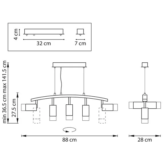 Артикул: LR7353651; Бренд: Lightstar; Коллекция: Rullo; Стиль: High-tech; Тип светильника: Подвесная; место размещения: Жилая; Тип крепления: Накладной; На планку; Степень защиты: IP20; Напряжение питания, V: 220; Количество ламп: 5; Тип ламп: ГЛН; LED; Тип цоколя: GU10; Мощность ламп, W: 50; Общая мощность LED, W: 30; Общая мощность, W: 250; Материал каркаса: металл, Металл; Материал плафона: Металл; Акрил; Цвет каркаса: черный, Черный; Цвет плафона: Белый; Матовый; Лампы в комплекте: Нет; Длина, мм: 880; Ширина, мм: 280; высота: 275; min высота: 365; max высота: 1 415; Длина потолочной чаши, мм: 320; Ширина потолочной чаши, мм: 70; Высота потолочной чаши, мм: 40; Вес, кг: 2,86; Штрихкод: 8053176898669