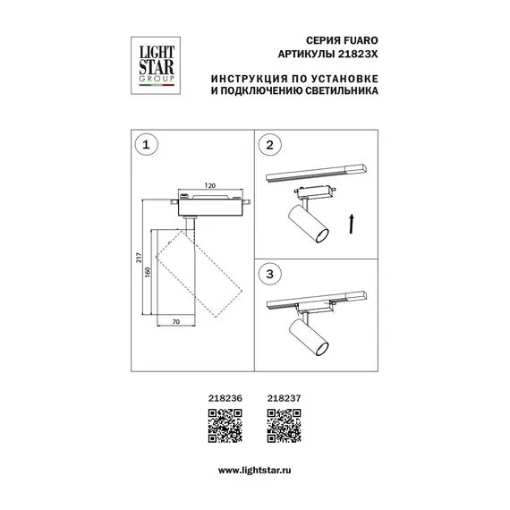Артикул: 218237; Бренд: Lightstar; Коллекция: Fuoco; Тип светильника: Однофазный Barra; место размещения: Жилая; Общественная; Срок службы, ч: 20 000; Степень защиты: IP20; Напряжение питания, V: 220; Угол рассеивания, град: 24; Угол поворота по вертикали, град: 360; Угол поворота по горизонтали, град: 90; Общая мощность LED, W: 25; Световой поток, Lm: 2 350; 2 420; 2 500; Цветовая температура, K: 3 000 / 4 000 / 6 000; Индекс цветопередачи: 80; Материал каркаса: Металл; Пластик; Материал плафона: металл, Металл; Цвет каркаса: черный, Черный; Цвет плафона: черный, Черный; высота: 230; Диаметр, мм: 70; Вес, кг: 0,515; Штрихкод: 8050046565522