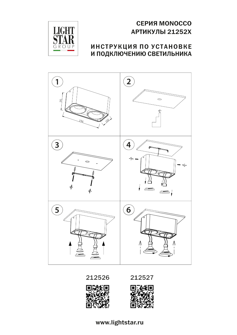 Артикул: 212526; Бренд: Lightstar; Коллекция: Monocco; Стиль: High-tech; место размещения: Жилая; Общественная; Тип крепления: Накладной; На планку; Степень защиты: IP20; Напряжение питания, V: 220; Угол поворота по горизонтали, град: 45; Количество ламп: 2; Тип ламп: ГЛН; LED; Тип цоколя: GU10; Мощность ламп, W: 50; Общая мощность LED, W: 14; Общая мощность, W: 100; Материал каркаса: металл, Металл; Материал плафона: металл, Металл; Цвет каркаса: белый, Белый; Цвет плафона: белый, Белый; Длина, мм: 195; Ширина, мм: 100; высота: 90; Длина потолочной чаши, мм: 195; Ширина потолочной чаши, мм: 100; Вес, кг: 0,75; Штрихкод: 8050046561067