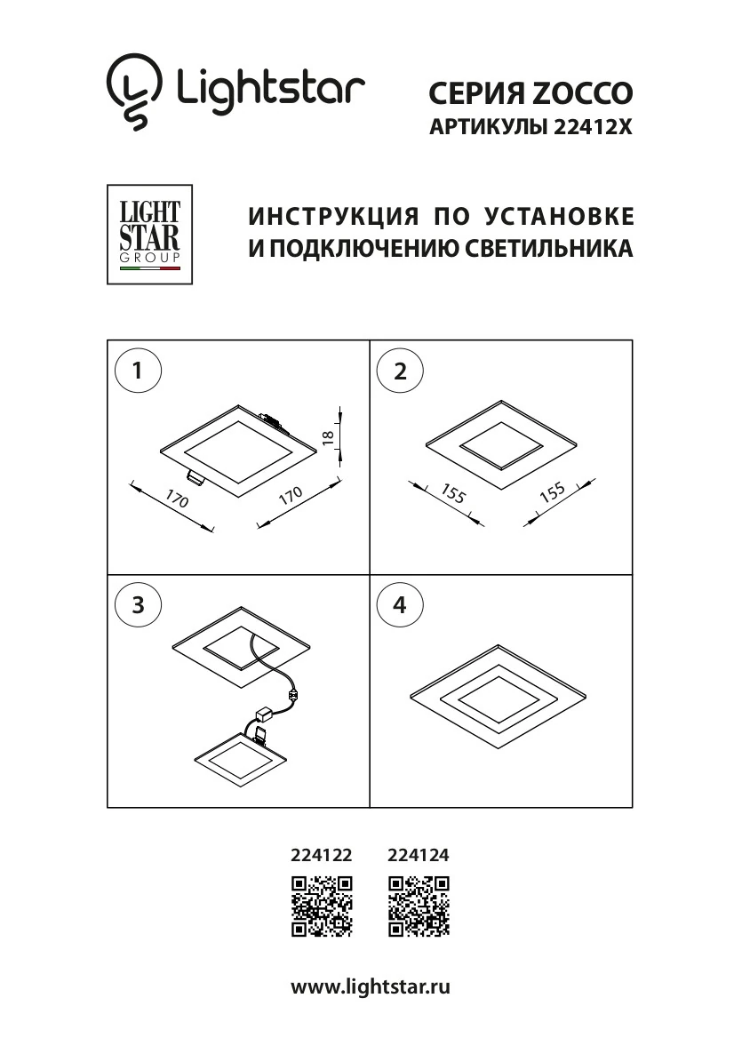 Артикул: 224124; Бренд: Lightstar; Коллекция: Zocco; Стиль: Classic; место размещения: Жилая; Общественная; Срок службы, ч: 20 000; Тип крепления: Врезной; Пружинное; Напряжение питания, V: 220; Общая мощность LED, W: 12; Световой поток, Lm: 900; Цветовая температура, K: 4 000; Индекс цветопередачи: 80; Материал каркаса: металл, Металл; Материал плафона: Металл; Пластик; Цвет каркаса: белый, Белый; Цвет плафона: Белый; Матовый; Длина, мм: 170; Ширина, мм: 170; высота: 2; Длина потолочной чаши, мм: 151; Ширина потолочной чаши, мм: 151; Высота потолочной чаши, мм: 18; Вес, кг: 0,2; Штрихкод: 8050046564303