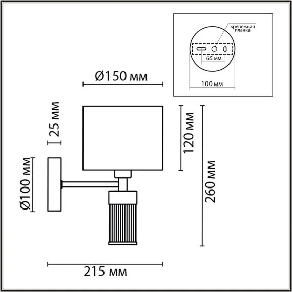 Артикул: 8109/1W; 0048043; Бренд: Lumion; Коллекция: MODERNI; Линия: DAMONA; Стиль: Classic; Назначение: Бра; место размещения: в спальню; в гостиную; в прихожую; на лестницу; Тип крепления: крепление на планке; Степень защиты: IP20; Площадь освещения, м2: 2; Напряжение питания, V: 220; Класс защиты: 1; Класс электро-безопасности: I; Температурный режим: -5...+40; Количество ламп: 1; Тип ламп: накаливания, Накаливания; Тип цоколя: E14; Мощность ламп, W: 40; Max мощность лампы, W: 40; Общая мощность, W: 40; Материал каркаса: металл, Металл; Материал плафона: текстиль, Текстиль; Поверхность каркаса: глянцевый; Поверхность плафона: матовый; Цвет: латунь титаниум/бежевый; Цвет каркаса: латунь, Латунь; Цвет плафона: бежевый, Бежевый; Гарантия, мес: 30; Длина, мм: 215; Ширина, мм: 150; высота: 260; Вес, кг: 0,890; Вес упаковки, кг: 4,650; Длина упаковки, см: 95; Ширина упаковки, см: 42; Высота упаковки, см: 27; Объем упаковки, м3: 0,00900; Штрихкод: 4690344149600