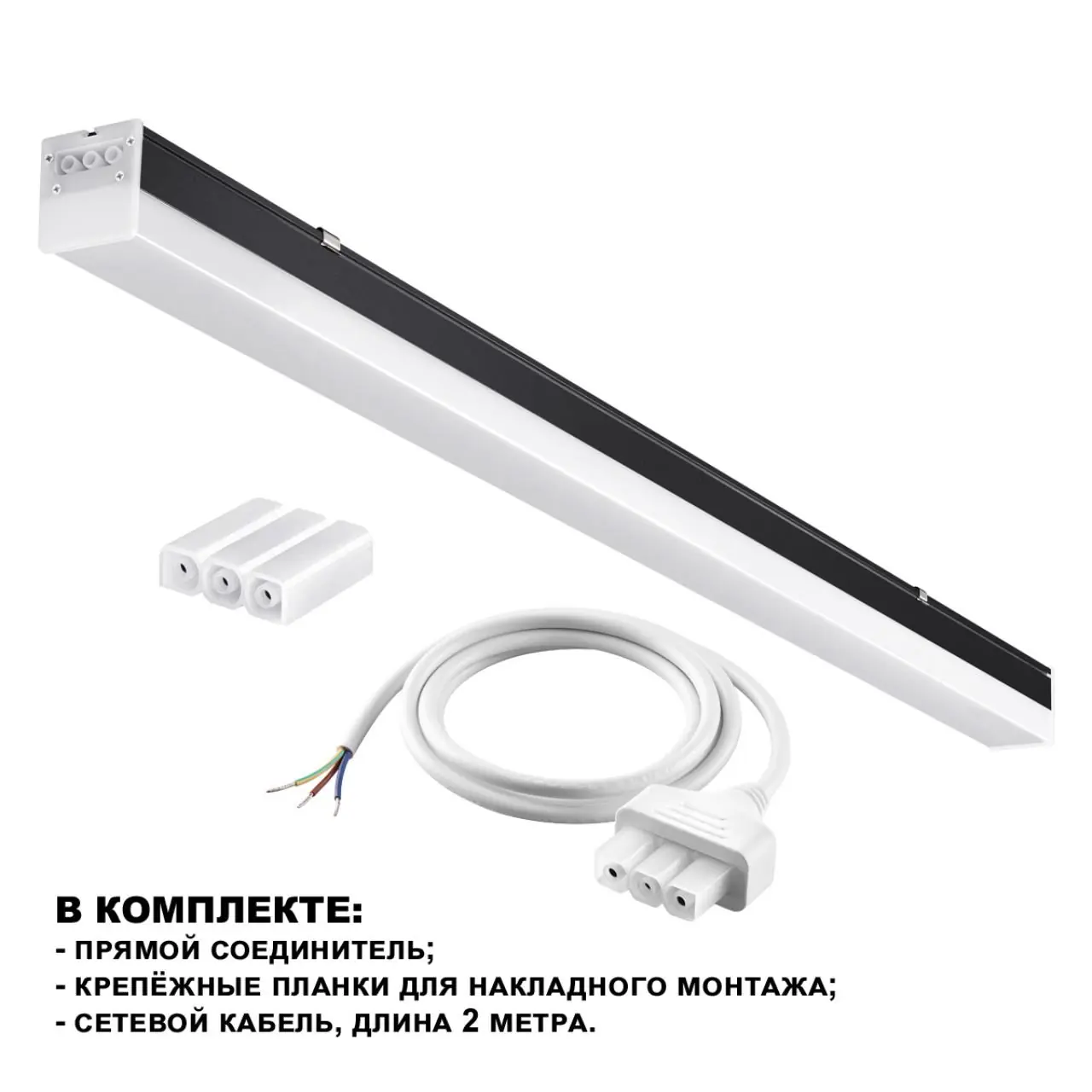 Артикул: 359113; Бренд: NOVOTECH; Коллекция: OVER; Линия: BITS; Стиль: High-tech; товарная группа: Светильник линейный светодиодный, в комплекте прямой соединитель, крепёжные планки, сетевой кабель 2; Назначение: Линейная система BITS; Тип светильника: Накладной/подвесной; место размещения: технический; Тип крепления: крепление на планке; Степень защиты: IP20; Площадь освещения, м2: 25; Напряжение питания, V: 100-265; Угол рассеивания, град: 120°; Класс защиты: 1; Класс электро-безопасности: I; Количество ламп: 1; Тип ламп: светодиодная (LED); Тип цоколя: LED; Мощность ламп, W: 50; Общая мощность, W: 50; Световой поток, Lm: 5000; Цветовая температура, K: 4000; Цвет LED: белый; Материал каркаса: металл; Поверхность каркаса: матовый; Цвет: черный; Цвет каркаса: черный; Гарантия, мес: 24; Длина, мм: 1500; Ширина, мм: 54; высота: 58; Вес, кг: 1,340; Вес упаковки, кг: 1,515; Длина упаковки, см: 165.5; Ширина упаковки, см: 6; Высота упаковки, см: 6.5; Объем упаковки, м3: 0,00645; Штрихкод: 4690344127332