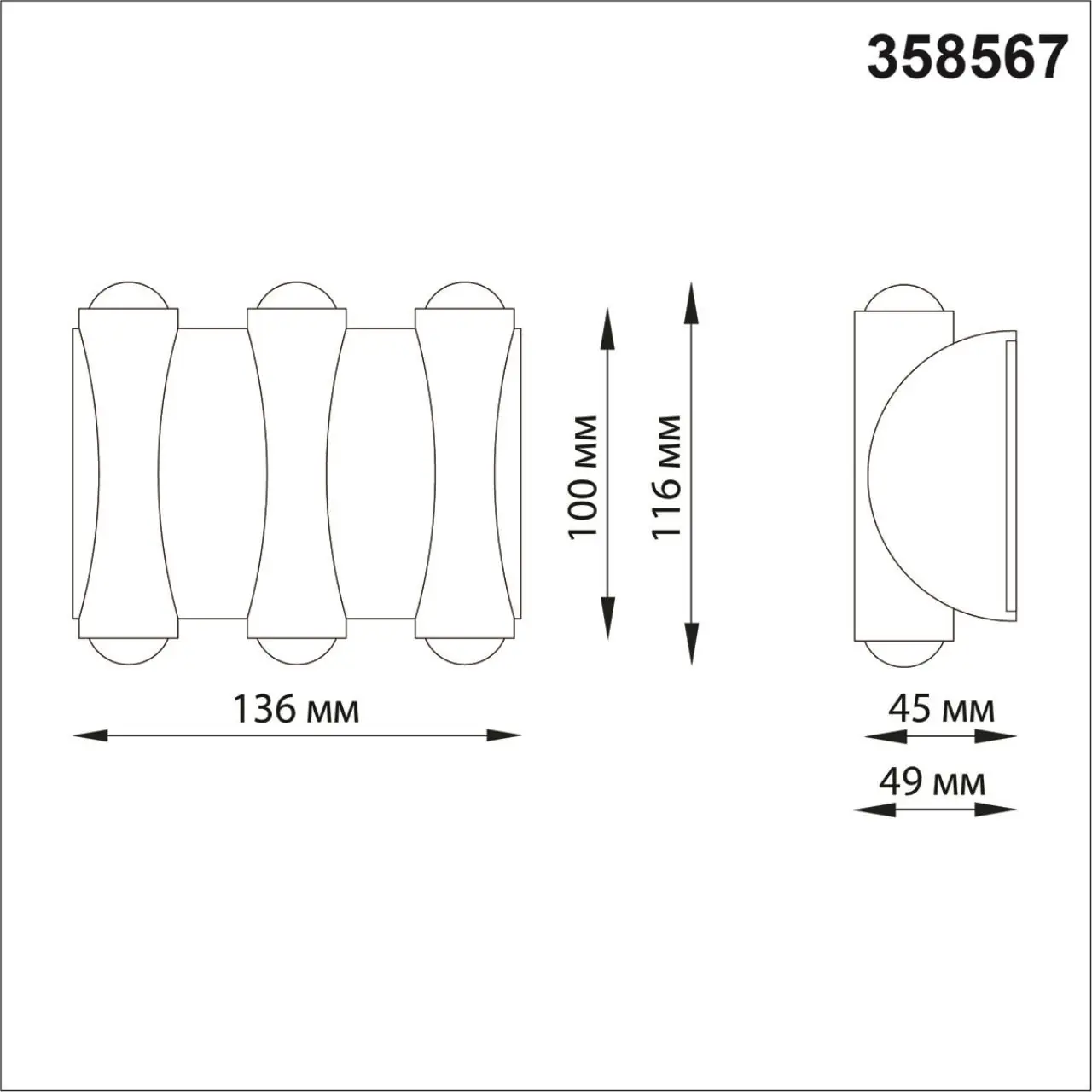 Артикул: 358567; Бренд: NOVOTECH; Коллекция: STREET; Линия: CALLE; Стиль: High-tech; товарная группа: Ландшафтный настенный светильник; Назначение: Уличные (фасадные); Степень защиты: IP54; Площадь освещения, м2: 2,5; Напряжение питания, V: 85-265; Угол рассеивания, град: 50; Класс защиты: 1; Класс электро-безопасности: I; Температурный режим: от -20 до +50 С; Количество ламп: 6; Тип ламп: светодиодная (LED); Тип цоколя: LED; Мощность ламп, W: 6; Общая мощность, W: 6; Световой поток, Lm: 510; Цветовая температура, K: 4000; Цвет LED: белый; Цвет: темно-серый; Гарантия, мес: 24; Длина, мм: 136; Ширина, мм: 116; высота: 49; Вес, кг: 0,400; Вес упаковки, кг: 0,480; Длина упаковки, см: 11.5; Ширина упаковки, см: 5; Высота упаковки, см: 14.5; Объем упаковки, м3: 0,00080; Штрихкод: 4690344106764