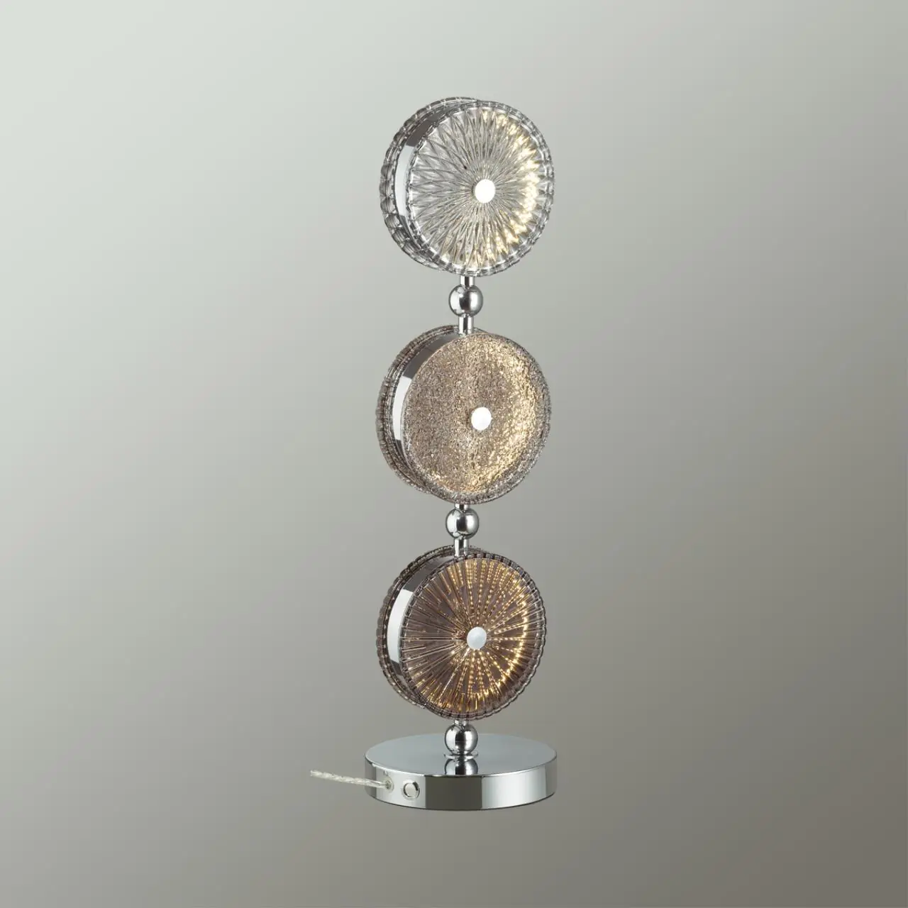 Артикул: 5416/13TL; 0045938; Бренд: Odeon Light; Коллекция: L-VISION; Линия: CARAMELLA; Стиль: Neo Classic; Назначение: Настольная лампа; место размещения: Интерьерный; Степень защиты: IP20; Площадь освещения, м2: 4; Напряжение питания, V: 220; Класс защиты: II; Класс электро-безопасности: II; Температурный режим: 0-(+40); Количество ламп: 1; Тип ламп: светодиодная (LED); Тип цоколя: LED; Мощность ламп, W: 18; Max мощность лампы, W: 18; Общая мощность, W: 18; Напряжение лампы, V: 220V; Световой поток, Lm: 950; Цветовая температура, K: 4000; Цвет LED: дневной свет; Материал каркаса: металл, Металл; Материал плафона: стекло, Стекло; Поверхность каркаса: глянцевый; Поверхность плафона: глянцевый; Цвет: хром/светло-серый/коричневый; Цвет каркаса: хром, Хром; Цвет плафона: разноцветный, Разноцветный; Тип выключателя: выключатель на основании; Гарантия, мес: 30; Ширина, мм: 48; высота: 610; Диаметр, мм: 170; Вес, кг: 3,500; Вес упаковки, кг: 4.2; Длина упаковки, см: 67; Ширина упаковки, см: 24; Высота упаковки, см: 25; Объем упаковки, м3: 0,04020; Штрихкод: 4690344124980