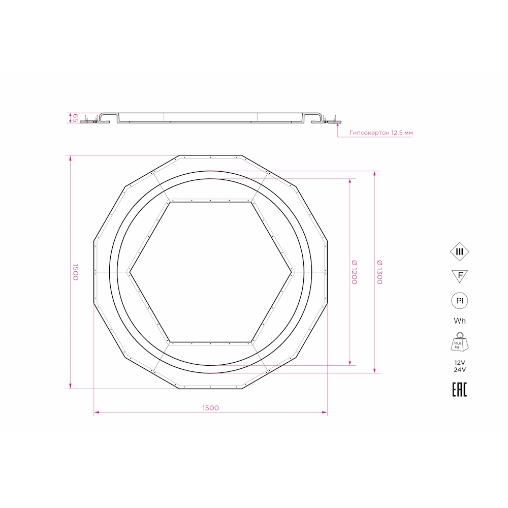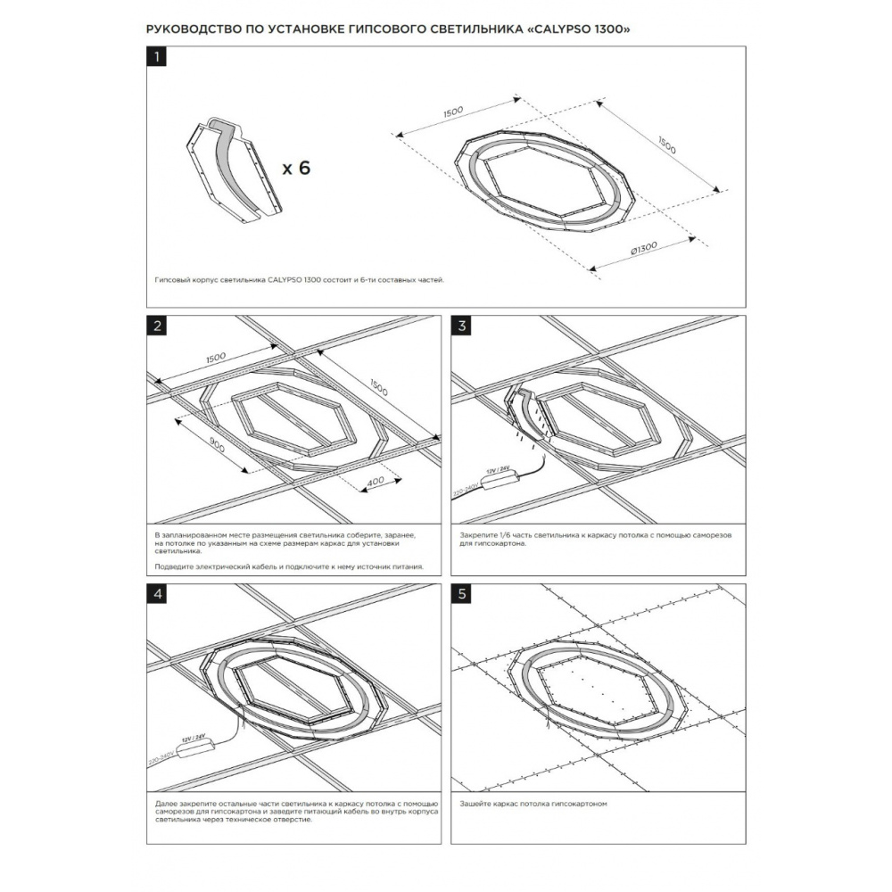 Артикул: SN 630; Бренд: Stellanova; товарная группа: кольцевой встраиваемый; Материал: высокопрочный микроармированный гипс, металл; Цвет: белый (под покраску); Комплектация: Корпус гипсовый - 6 шт; Радиатор алюминиевый под светодиодную ленту (0,7 м) - 6 шт; Руководство по эксплуатации и установке - 1 шт; Упаковка индивидуальная (пенопласт, картон) - 1 шт;; Размер видимой части: Ø1300 мм; Габариты: 1500/1500/65 мм; Вес, кг: 34,2 кг