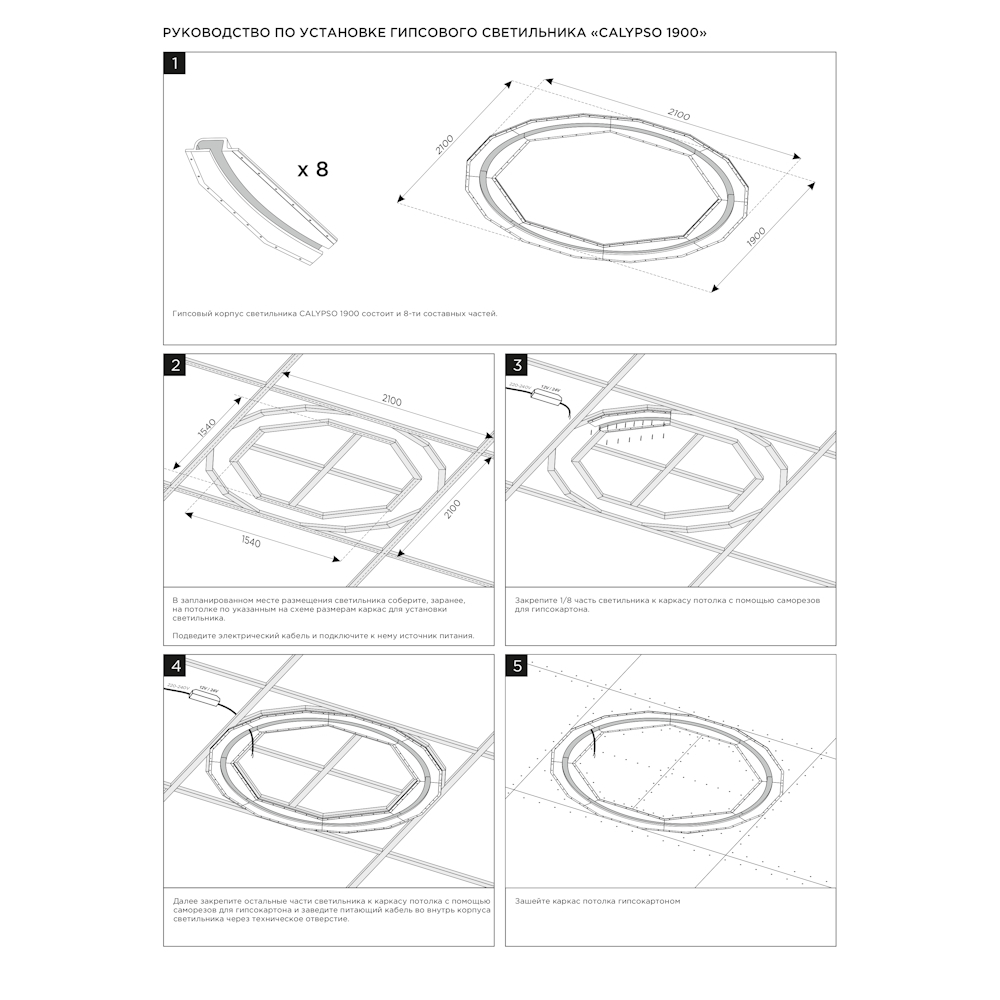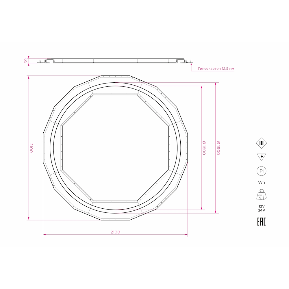 Артикул: SN 650; Бренд: Stellanova; товарная группа: кольцевой встраиваемый; Материал: высокопрочный микроармированный гипс, металл; Цвет: белый (под покраску); Комплектация: Корпус гипсовый - 8 шт; Радиатор алюминиевый под светодиодную ленту (0,8 м) - 8 шт; Руководство по установке и эксплуатации - 1 шт; Упаковка индивидуальная (пенопласт, картон) - 1 шт;; Размер видимой части: Ø1900 мм; Габариты: 2100/2100/65 мм; Вес, кг: 50,5 кг