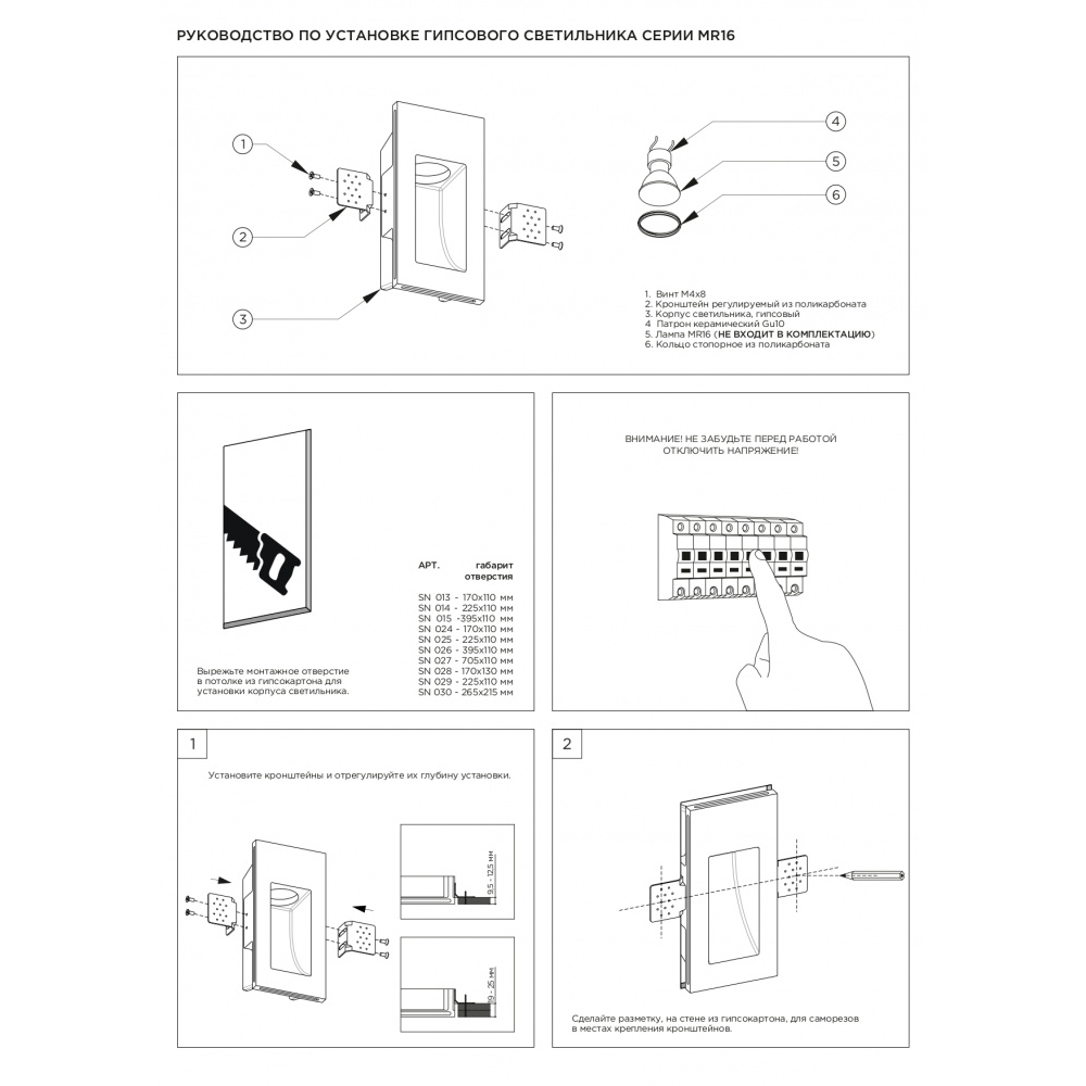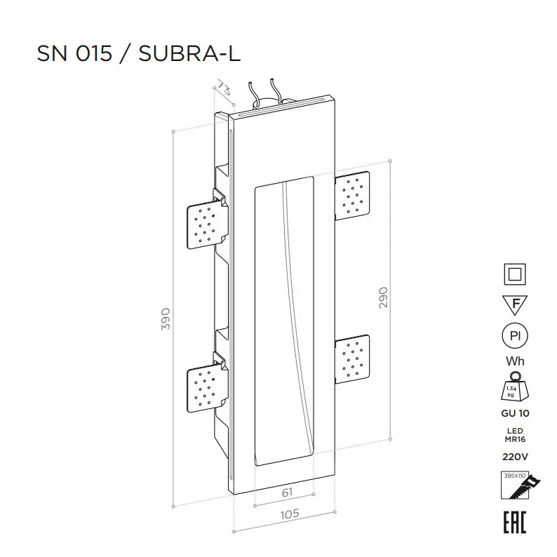 Артикул: SN 015; Бренд: Stellanova; товарная группа: стеновой встраиваемый; Материал: высокопрочный микроармированный гипс, поликарбонат, металл; Цвет: белый (под покраску); Комплектация: Корпус гипсовый - 1 шт; Кронштейн монтажный регулируемый - 4 шт; Винт установочный - 8 шт; Патрон керамический GU10 - 1 шт; Клемма соединительная - 2 шт; Кольцо стопорное - 1 шт; Руководство по эксплуатации и установке - 1 шт; Упаковка индивидуальная (пен; Размер видимой части: 290х61 мм; Габариты: 390/105/72,5 мм; Вес, кг: 1,50 кг