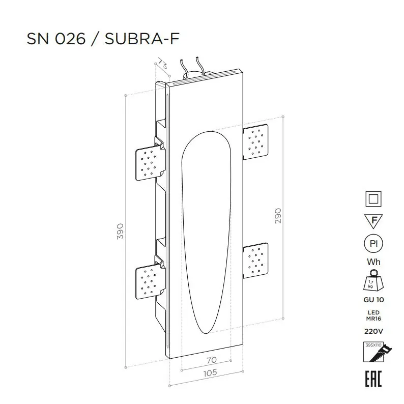 Артикул: SN 026; Бренд: Stellanova; товарная группа: стеновой встраиваемый; Материал: высокопрочный микроармированный гипс, поликарбонат, металл; Цвет: белый (под покраску); Комплектация: Корпус гипсовый - 1 шт; Кронштейн монтажный регулируемый - 4 шт; Винт установочный - 8 шт; Патрон керамический GU10 - 1 шт; Клемма соединительная - 2 шт; Кольцо стопорное - 1 шт; Руководство по эксплуатации и установке - 1 шт; Упаковка индивидуальная (пен; Размер видимой части: 290х70 мм; Габариты: 390/105/72,5 мм; Вес, кг: 2,10 кг