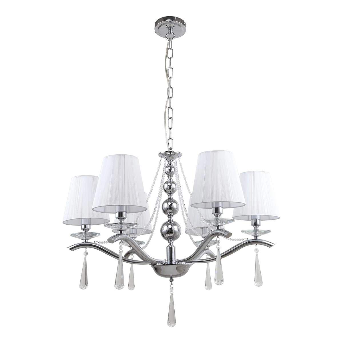 Артикул: 1042/09/06P; Бренд: Stilfort; Коллекция: Nifty; Стиль: Art Deco; место размещения: Для спальни; Форма: Конусный; Тип крепления: На планку; На потолок; Степень защиты: IP20; Площадь освещения, м2: 13; Напряжение питания, V: 220-240; Натяжные потолки: Да; Количество ламп: 6; Тип ламп: накаливания, Накаливания; Тип цоколя: E14; Мощность ламп, W: 40; Общая мощность, W: 240; Материал каркаса: металл, Металл; Материал плафона: ткань, Ткань; Цвет: белый; Цвет каркаса: хром, Хром; Цвет плафона: белый, Белый; Гарантия, мес: 12; высота: 710; Диаметр, мм: 720; Длина подвеса, мм: 310
