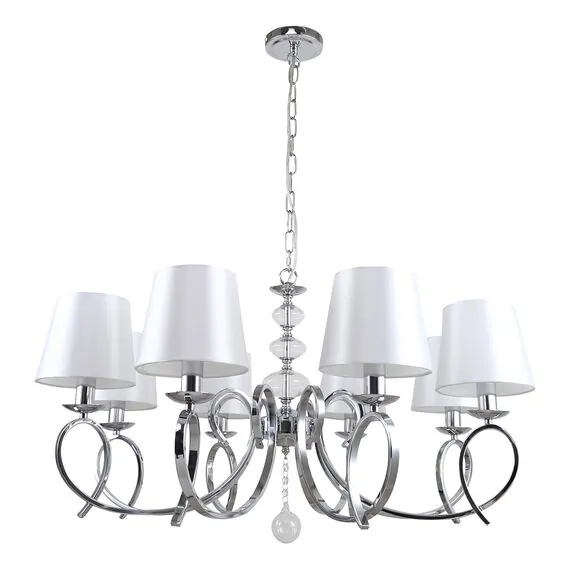 Артикул: 1043/09/08P; Бренд: Stilfort; Коллекция: Zafira; Стиль: Art Deco; место размещения: Для гостиной; Форма: Конусный; Тип крепления: На планку; На потолок; Степень защиты: IP20; Площадь освещения, м2: 17; Напряжение питания, V: 220-240; Натяжные потолки: Да; Количество ламп: 8; Тип ламп: накаливания, Накаливания; Тип цоколя: E14; Мощность ламп, W: 40; Общая мощность, W: 320; Материал каркаса: металл, Металл; Материал плафона: ткань, Ткань; Цвет: белый; Цвет каркаса: хром, Хром; Цвет плафона: белый, Белый; Гарантия, мес: 12; высота: 600; Диаметр, мм: 850; Длина подвеса, мм: 305